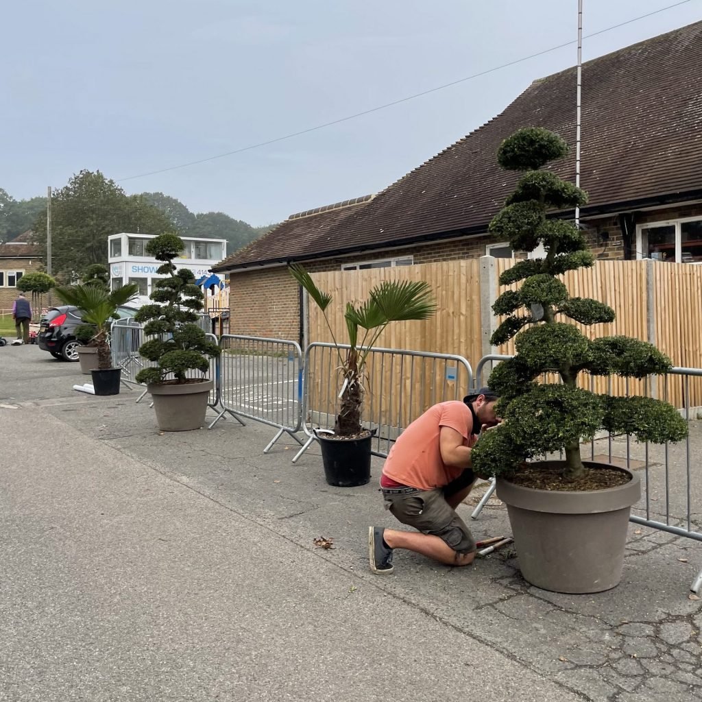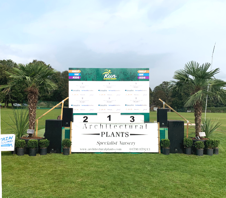 Very early on the morning of the race we left our nursery with a lorry packed full of plants and set off to build an avenue of Niwaki and Tropical palms to decorate the runners’ start and finish line and embellish the winners’ podium.