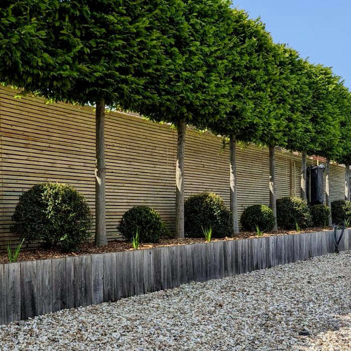 These are trained onto a frame to be planted at intervals of approximately 5-6ft to create a pleached hedge. These trees are deciduous and native and this practice is an ancient tradition in Europe – mostly for creating avenues in grand entrances but nowadays often used as a neat and formal approach to giving privacy.