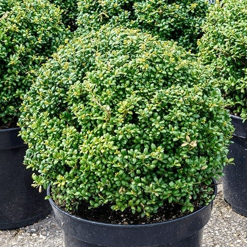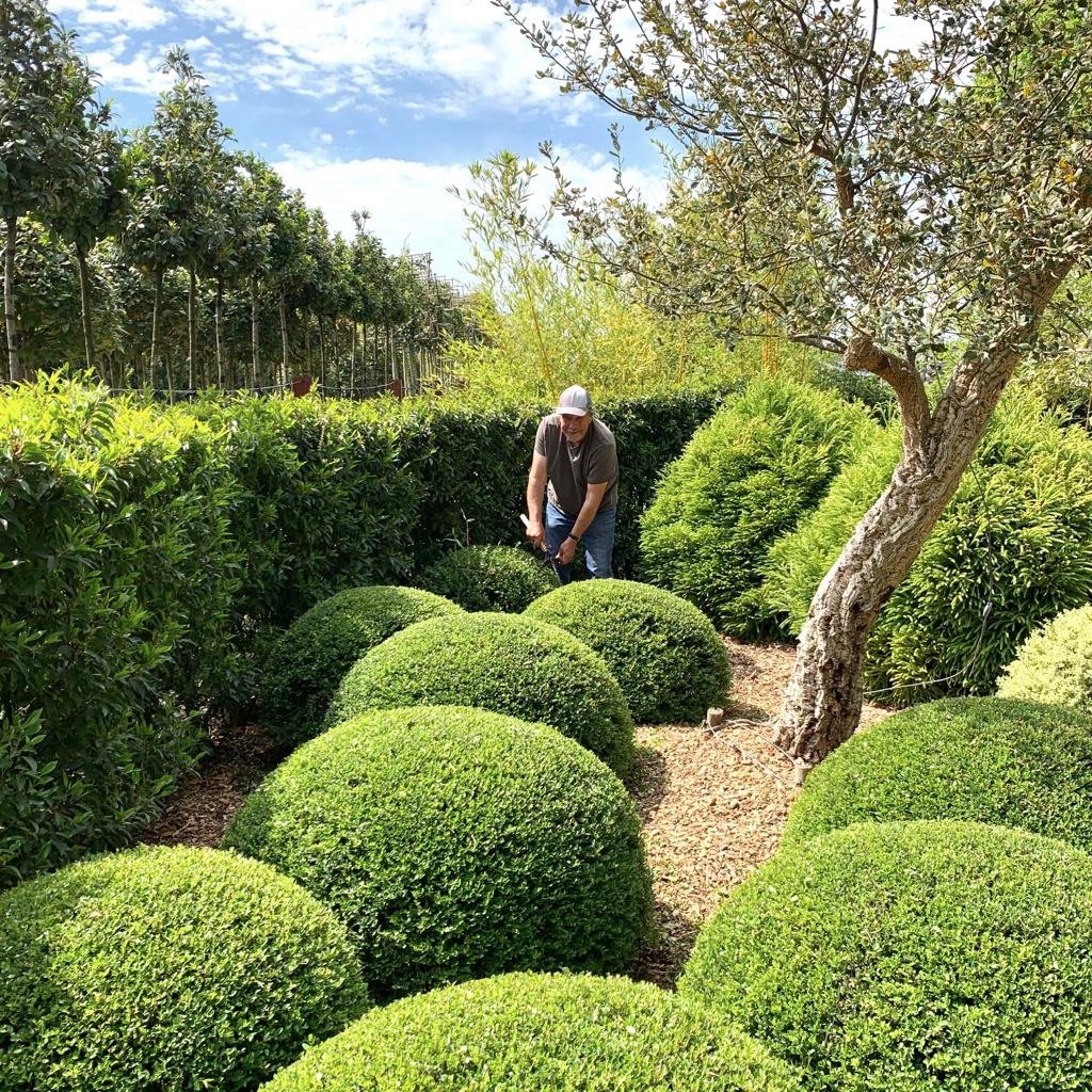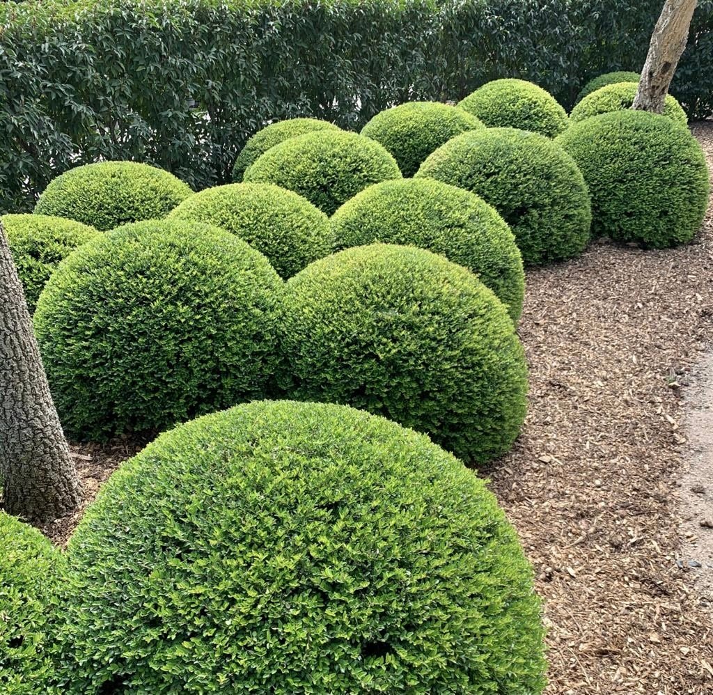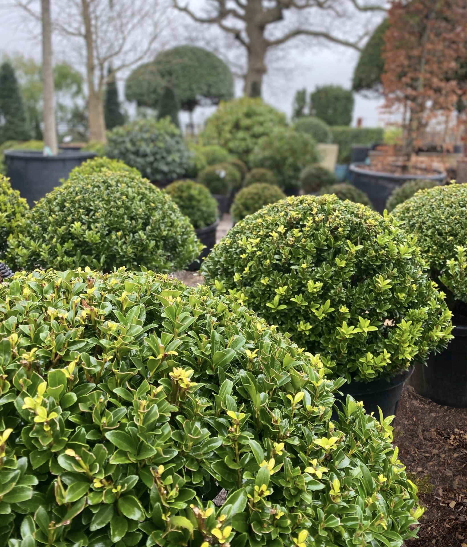 Recently we have been using Ilex maximowicziana balls, (fantastic name, but a bit of a mouthful, so usually known as ‘maxi balls.”) The leaves are a tad larger and it seems to be a bit faster growing and more robust than Ilex crenata.