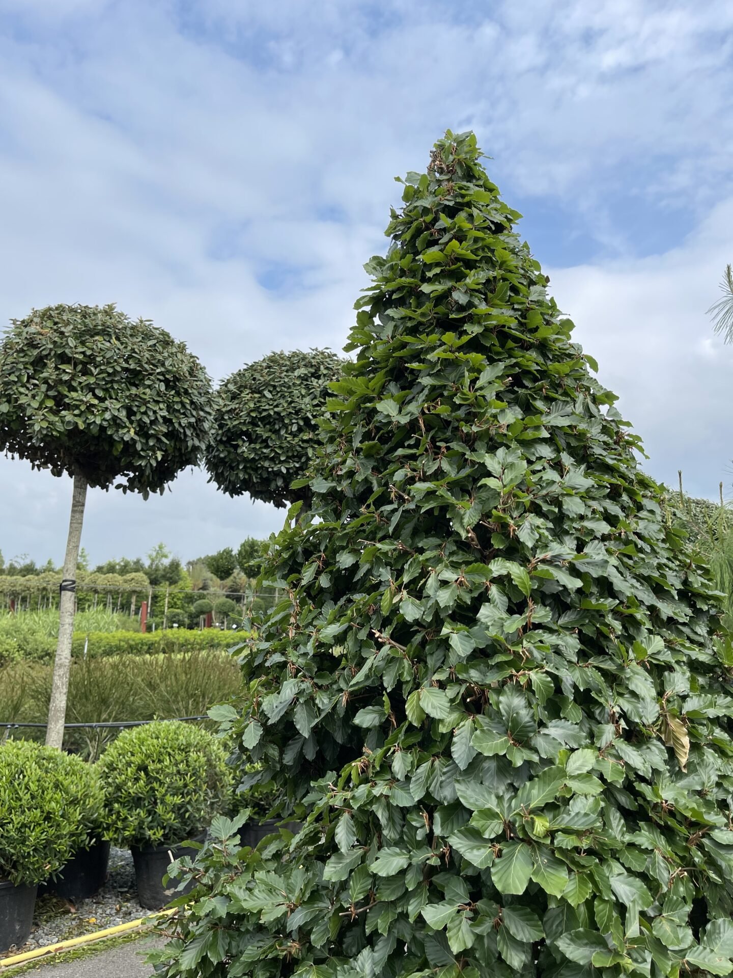 A substantial Fagus sylvatica clipped into a formal cone looks instantly mature and established