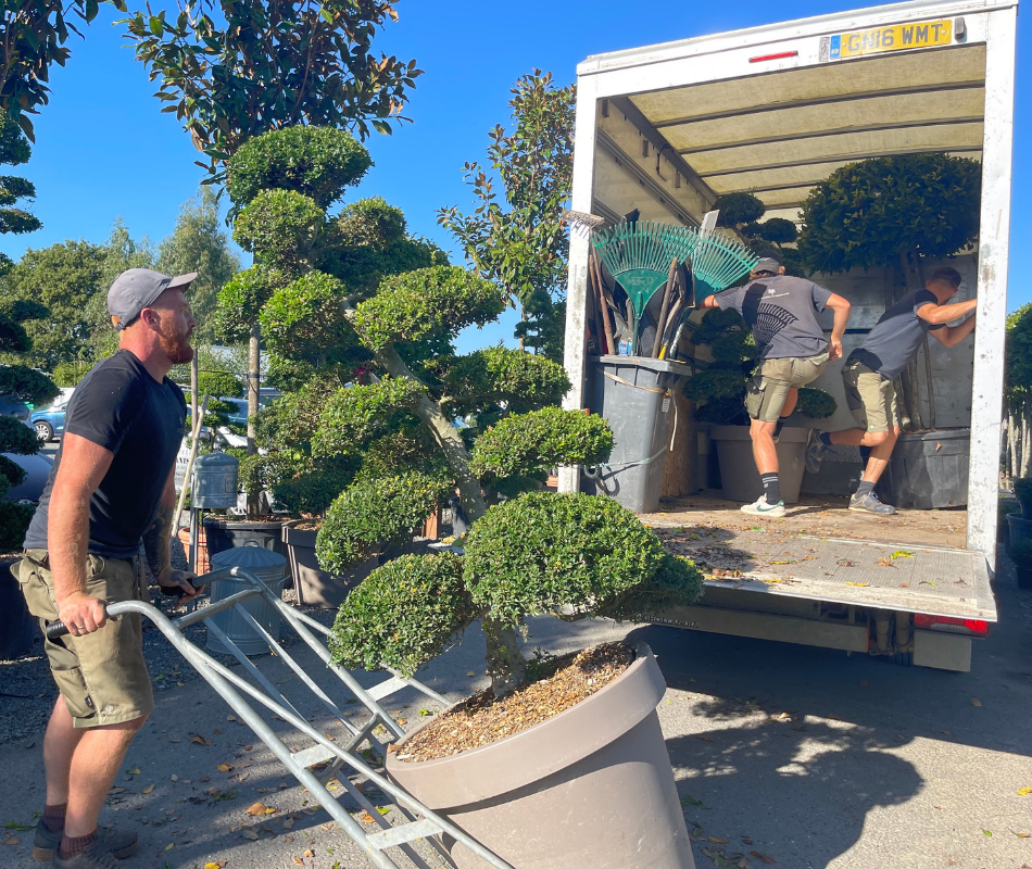 Very early on the morning of the race we left our nursery with a lorry packed full of plants and set off to build an avenue of Niwaki and Tropical palms to decorate the runners’ start and finish line and embellish the winners’ podium.