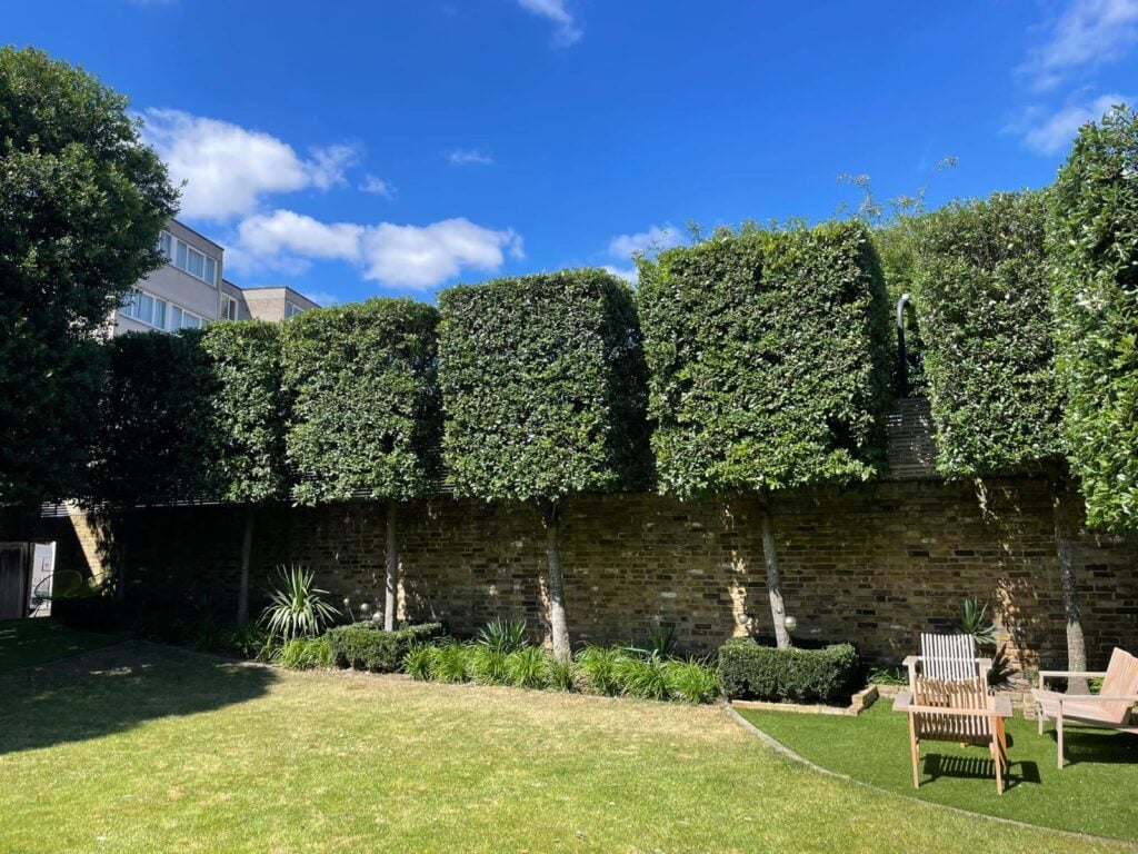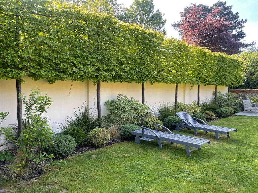 - Pleached Trees: Flat-sided, trained trees that provide structured screening without taking up depth. Ideal for narrow beds or courtyards.