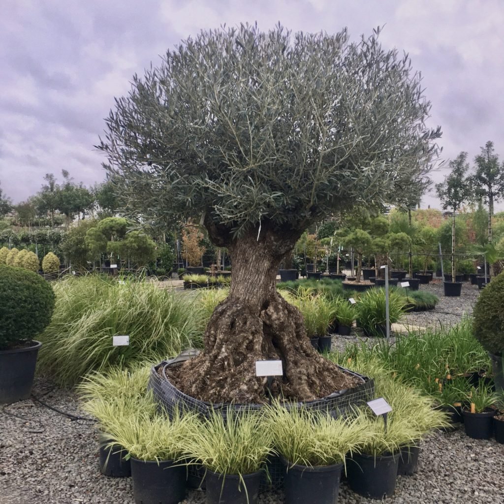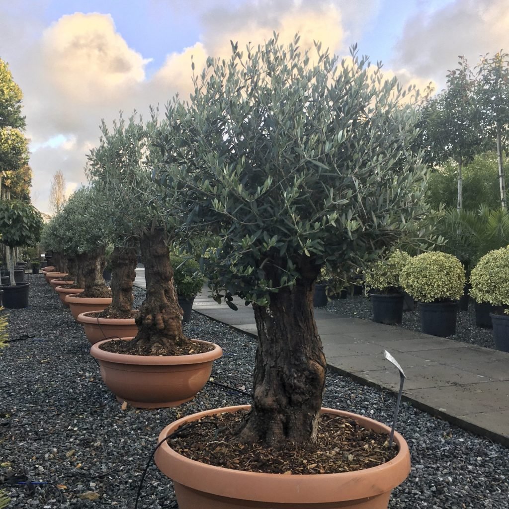 Our olives of this size, and our smaller ones, can be transported very successfully due to the fact that they exist very happily with a relatively small rootball. If you are not going to plant them in the ground, this characteristic also makes them suitable for keeping in raised pots and planters – as long as they are irrigated correctly and have access to plenty of sunlight. They do require a certain amount of shelter away from cold winds but if they do get a bit of a nip from a late frost they recover quickly. The bigger they are the tougher they seem to be.