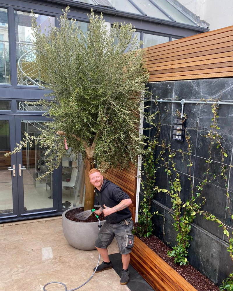 Freddie our Planting Team Manager watering in a potted courtyard olive