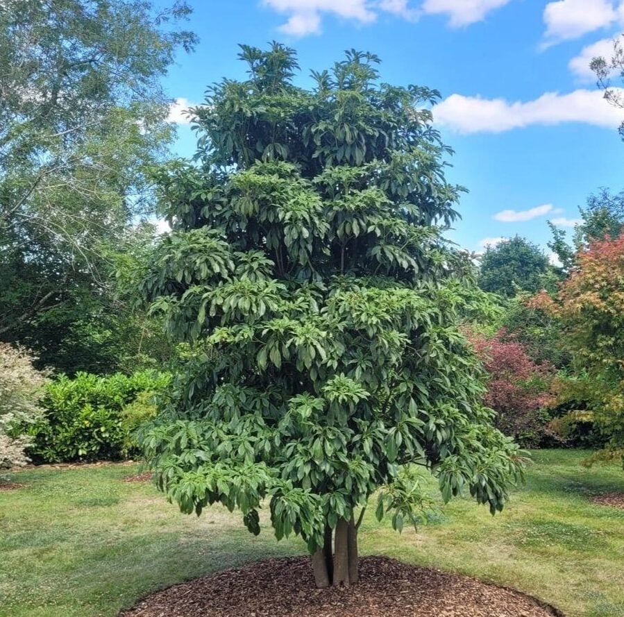 It’s worth reading our write up on Pseudopanax crassifolius as there are many similarities between these two trees. This one is considerably rarer in its native New Zealand but goes through the same extraordinary metamorphosis from stick with strange brown narrow saws hanging off it through to 14ft tall lollipop surmounted by a mass of shorter slightly greener leaves. To give it the full New Zealand treatment, grow in groves.