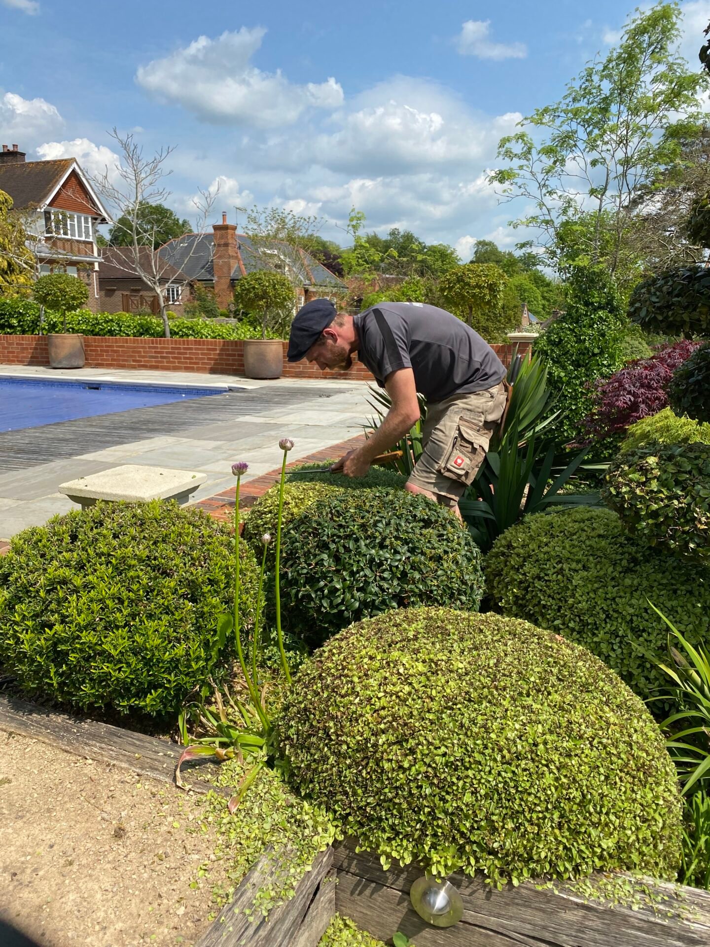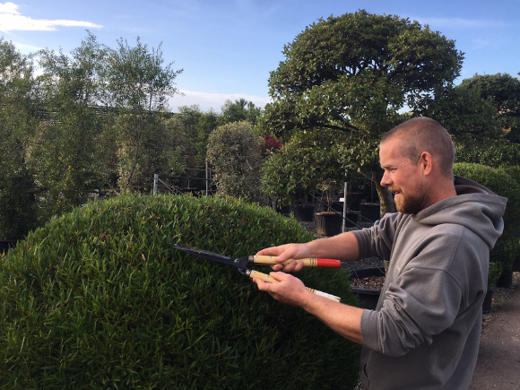 Sam leads the way with an excellent eye for clean lines and perfect symmetry. He is also highly creative and always keen to give you garden a unique accent should you be daring enough. He is supported by James but should the job require additional clippers, they have our pool of experts to call on – all of whom also regularly maintain the wide range of plants and trees we have at the nursery. We hope you might meet Linda who shapes and trains Niwaki, or Colin, the master of Cupressus sempervirens and blobberies, or Guy and Matt our foremost authorities on Trachycarpus care and stripping.