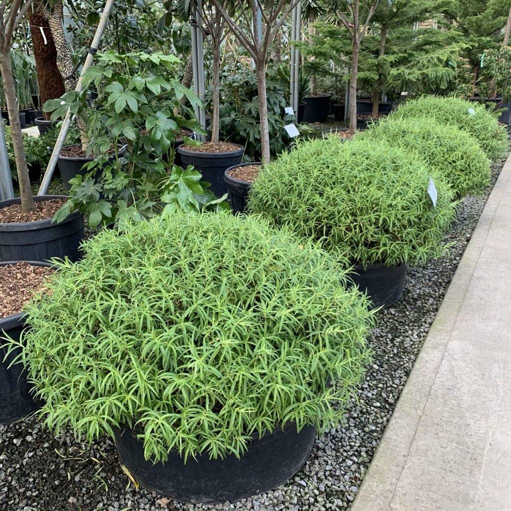 Hebe paviflora ‘angustifolia’ is the perfect fluffy clipped pillow and fantastically tactile. It has a delicate long leaf of emerald green that will last all through the winter. In mid summer, it naturally produces a copious crop of white flowers. Extremely frost hardy and will grow absolutely anywhere.