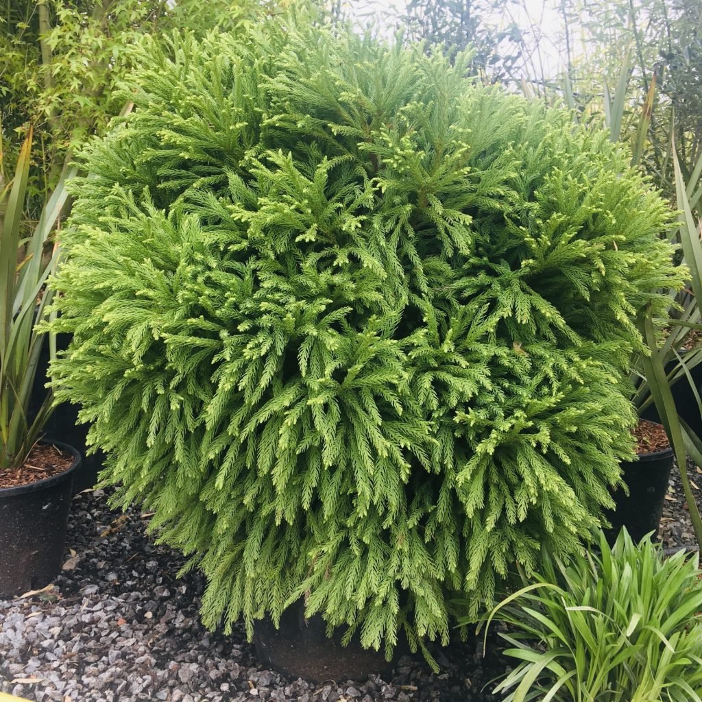 Cryptomeria japonica ‘Globosa Nana’ is an obscure variant of a large Japanese conifer. Fluffy, dense, globe shaped and wonderfully textured. They also bring subtle movement to a design when caught by the breeze. Raising the stem base adds further definition. Trim in the spring and plant in good organic and water retentive soil.