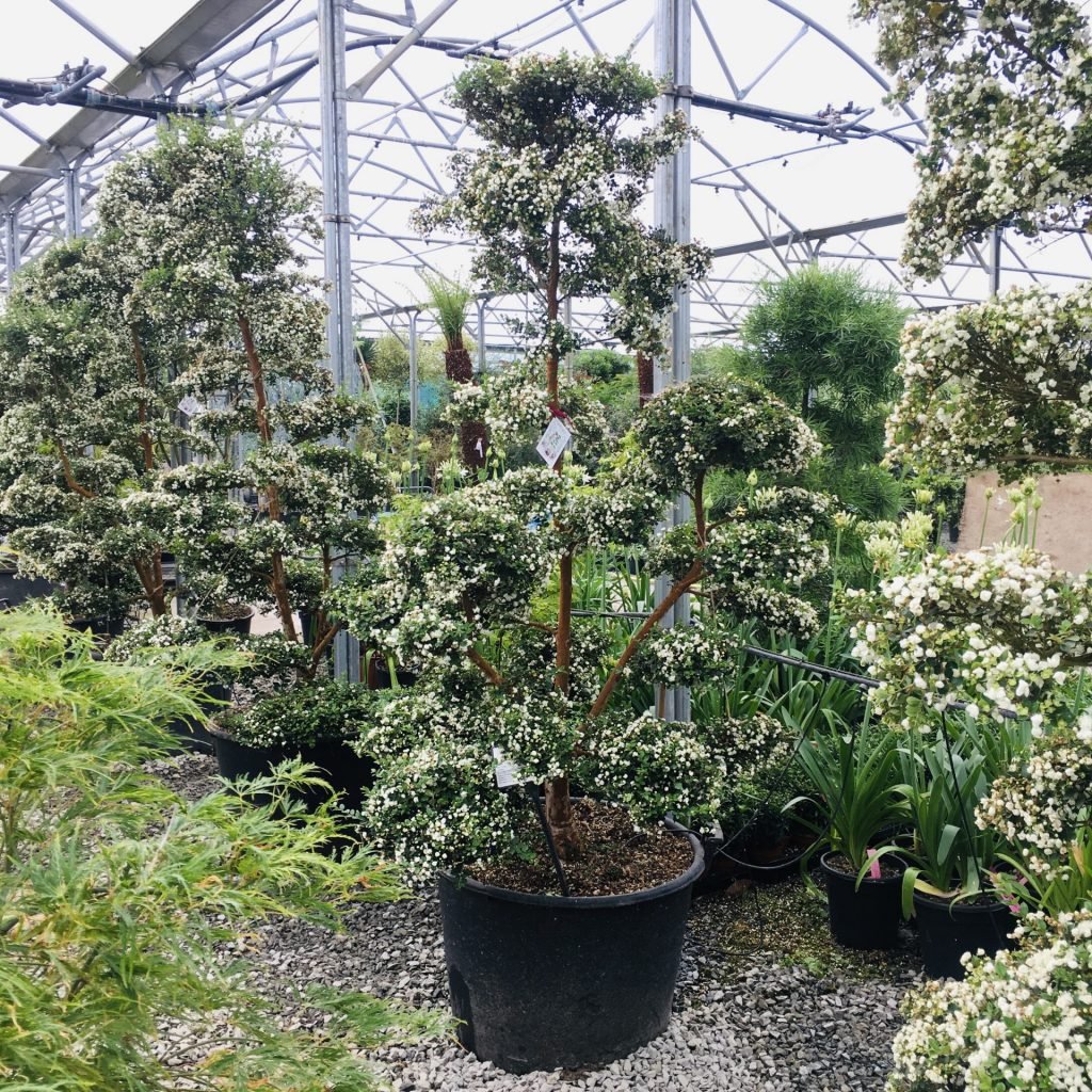 Myrtus apiculata ‘Niwaki’ has beautiful red bark and fragrant white flowers in early summer. It’s tolerant of sun or shade but very intolerant of dry conditions. It requires plenty of moisture to grow. It also needs shelter from cold winds. Grown, trained and shaped by us.