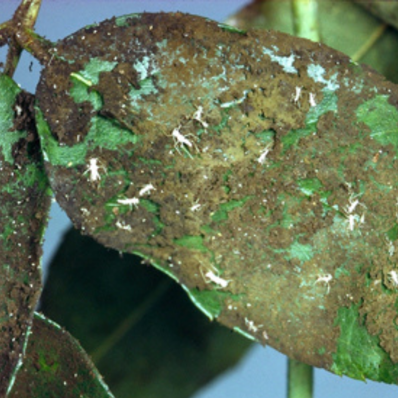 Whiteflies are sap suckers like aphids. They are very small bright white winged insects, normally found on the underside of leaves. They will also secrete honeydew which will attract sooty mould spores, lead to foliage distortion, and reduce the plant’s vigour.