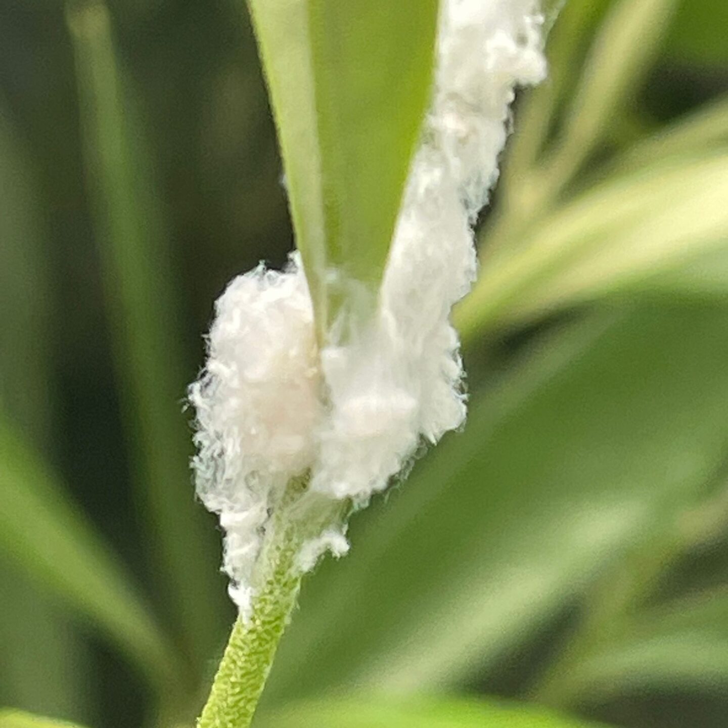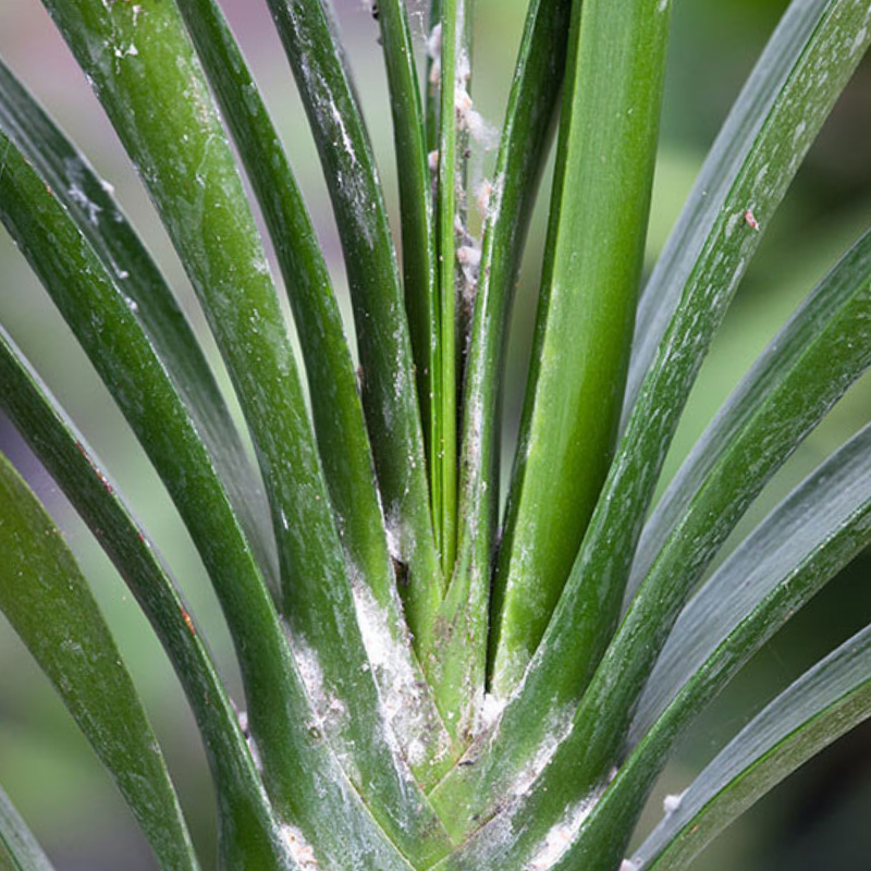 Mealybugs are excellent at hide-and-seek and will invariably settle in the most awkward places to treat. They particularly like leaf axils, the base of leaves in clump-forming plants, twisting stems in climbers, and bark crevices. The insect is quite small and a pink-orange colour, but they are more often spotted due to a white fluffy wax-like secretion that covers them as protection.