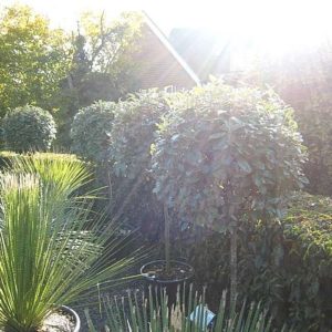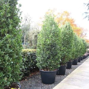 Hedging is all too often simply viewed as a functional servant – a boundary marker, a default choice for politely blocking out the neighbours, or put to task as a nondescript backdrop disguising something far worse. For these jobs we have a selection of commonly used plants: Elaeagnus x ebbingii, Prunus lusitanica, and its bigger leaved relative, Prunus laurocerasus ‘rotundifolia‘. Available as root balls April to March it is containerised the rest of the year. However, for the more adventurous we have exciting alternatives like, Myrtus apiculata, Pittosporum tenuifolium ‘Anderson’ and Podocarpus salignus, which provide you with a vast choice of tactile foliage, contrasting textures, varying shades of green, and even little ornamental flowers.