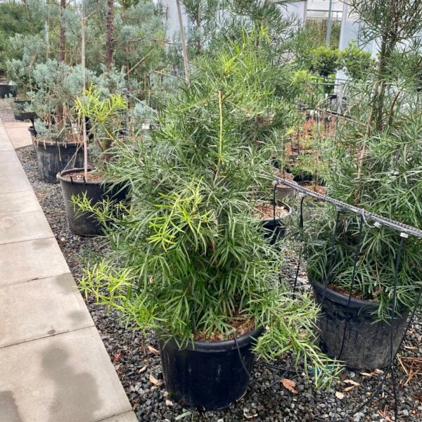 When we started the nursery, propagation of this tree was a problem. We took cuttings from the plant at (what was by then) South Lodge Hotel (with their cahoots, of course) but the plants we produced behaved like branches and grew along rather than up. Not so good. We occasionally managed to get seed from South America but it’s considered endangered in the wild so even this source dried up. Fortunately we discovered a garden in Cornwall where they had so many, they strimmed the seedlings. Annual pilgrimages were made to this secret location for many years. Eventually, we had so many established at the old nursery in Nuthurst that we became self sufficient in Podocarpus salignus seedlings.