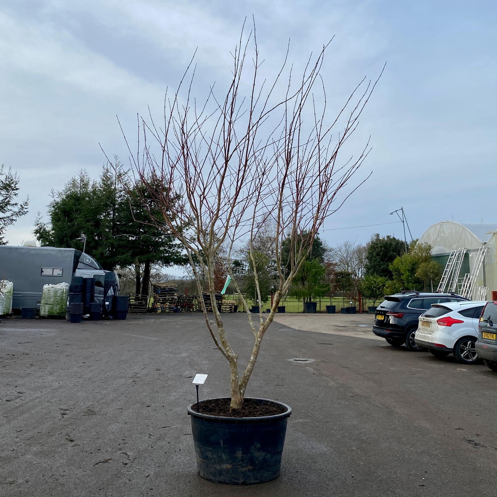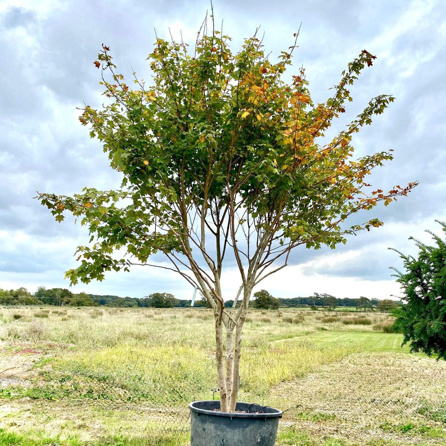 In spring, the five lobed leaves emerge red with a sharply pointed, slightly flexed and elegant shape. As the leaves develop the colour changes to a bright golden yellow, fading to green for the summer. In autumn, the tree becomes a bright, butter yellow before the foliage falls, leaving a pretty round headed silhouette for the winter. Hardy and easy, this is a handsome tree for full or partial sun on most moist but well-drained soils.