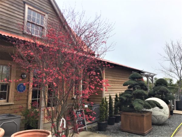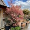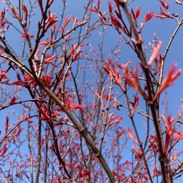 This acer has a wide, upright and spreading form with typically layered branches. Full and voluminous, but delicately-open, and therefore casting no deep or challenging shade for your accompanying plants. The winter stems have an architectural presence all of their own, and it could be said that they may benefit from the support of more structural, evergreen underplanting and shapely neighbours during its restful phase - but we would say that, wouldn’t we. Imagine an underplanting of pillowy Muehlenbeckias, Hebe sutherlandii or Cryptomeria japonica ‘Globosa Nana’: contrasting textural evergreens that have been clipped into a blobbery for the raspberry coloured leaves of this acer to tumble down and settle on. Then, before you know it, and just when you need it, this glorious attention seeker will burst forth and captivate you in spring. Slowly reaching approximately 6m, ‘Deshojo’ is a smashing addition for all gardens big and small, as well as being very well-suited for putting in a pot and having in a courtyard, or on a balcony.