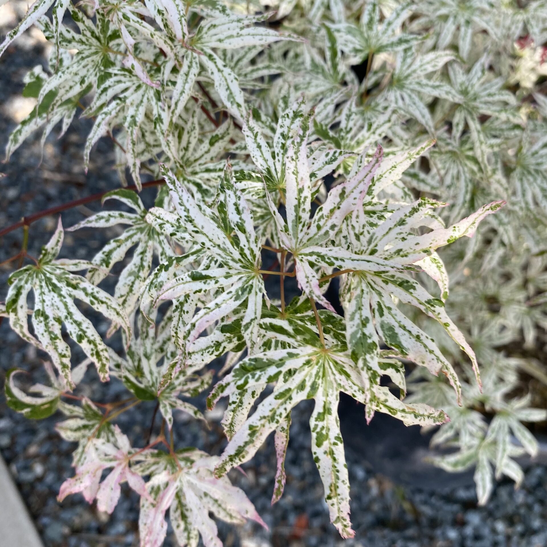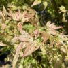 A rare and unusual coloured Maple. The new leaves are nearly white with a pink flush. They mature to green with white markings in the summer, turning shades of