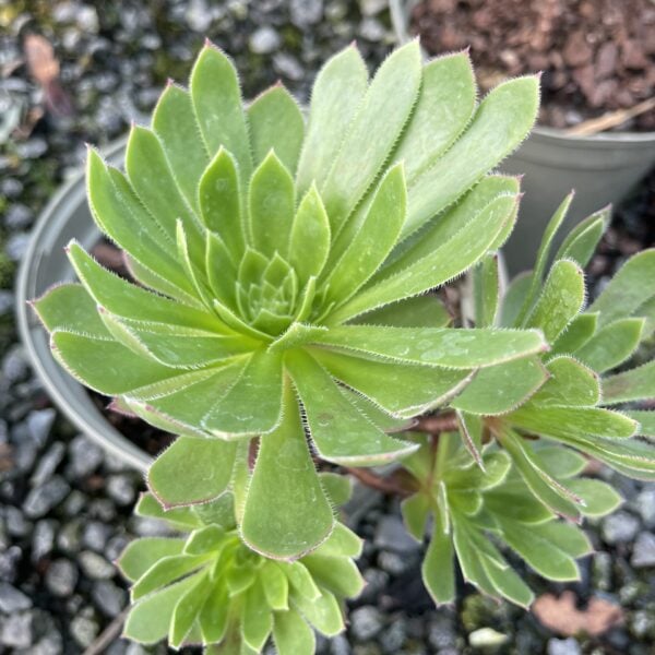 Unlike most of the Aeoniums this has a dense head of lots of miniature (green) rosettes. Please contact us for stock availability and sizes.