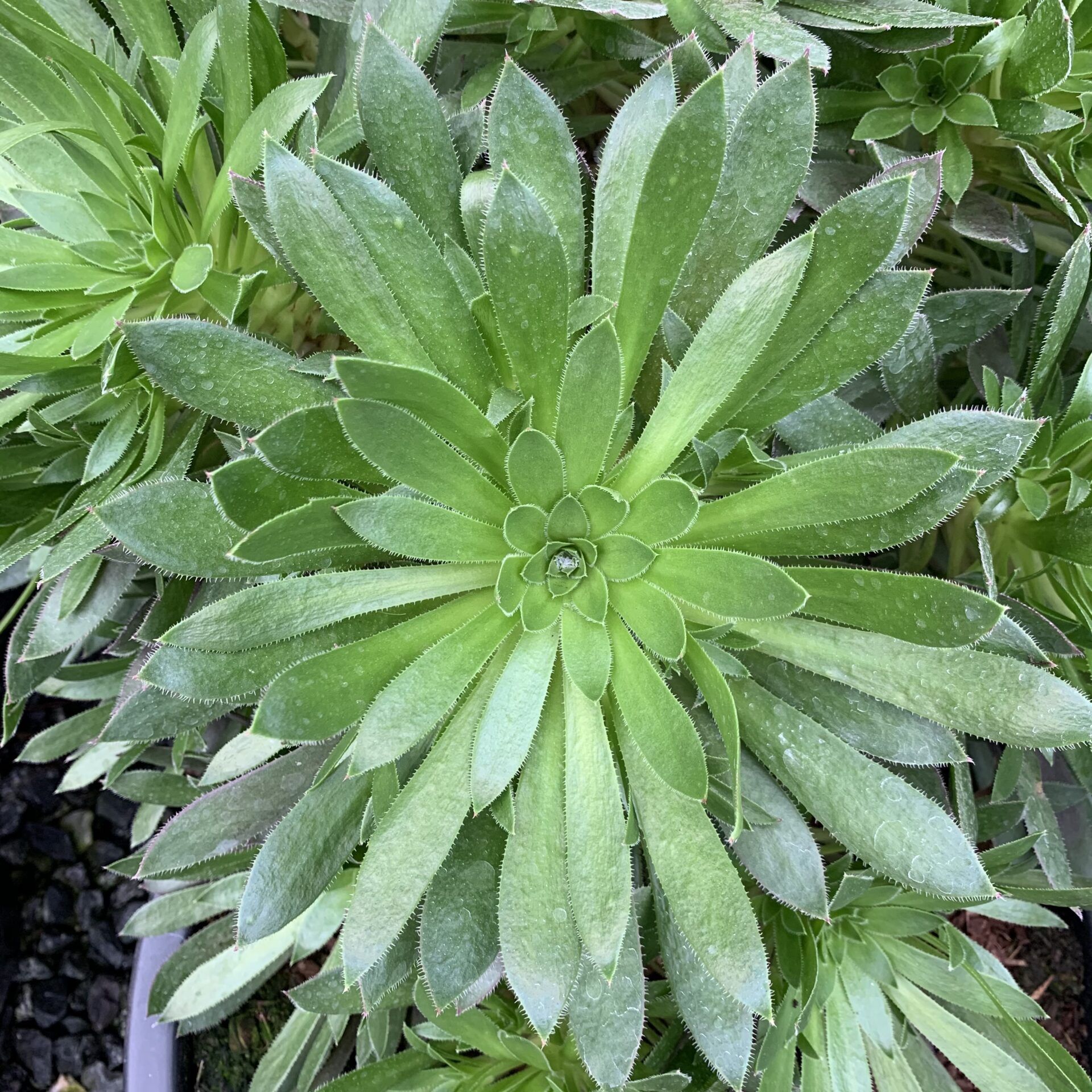 The leaves are maroon-edged (in good light. Do give it good light as it will be a pallid creature elsewhere. No one want’s Gollum at the party)) and they are clustered into dense rosettes at the end of their stems. The cushion-y quality of these plants is enhanced by the translucent hairs which edge the leaves fuzzily.