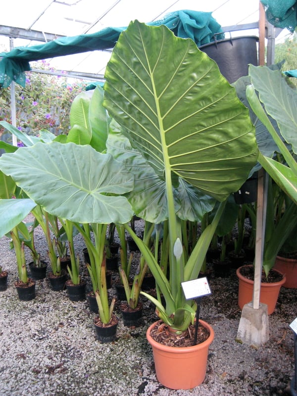 Big leaves seem to be an adaptation to low light levels and are often seen in plants that inhabit forest floors. Definitely the case here. Any direct sun bleaches the leaves yellow. It may survive in a little protected garden in central London or in a built up area close to the seaside but the main reason for us to grow this is a house plant. When asked, we always rather pompously point out that there's no such thing as a house plant but if there WAS - this is it. As long as you have space, just bung it in a saucer, make sure there's always water in the saucer and the only other thing you'll need to do is dust the good leaves and remove the old and tatty ones. If you suspect insect infestation, rather than use Biological Control or insecticide, just try wiping the leaves with a soapy sponge. Very effective. If anyone has this growing outside in the ground, please let us know.