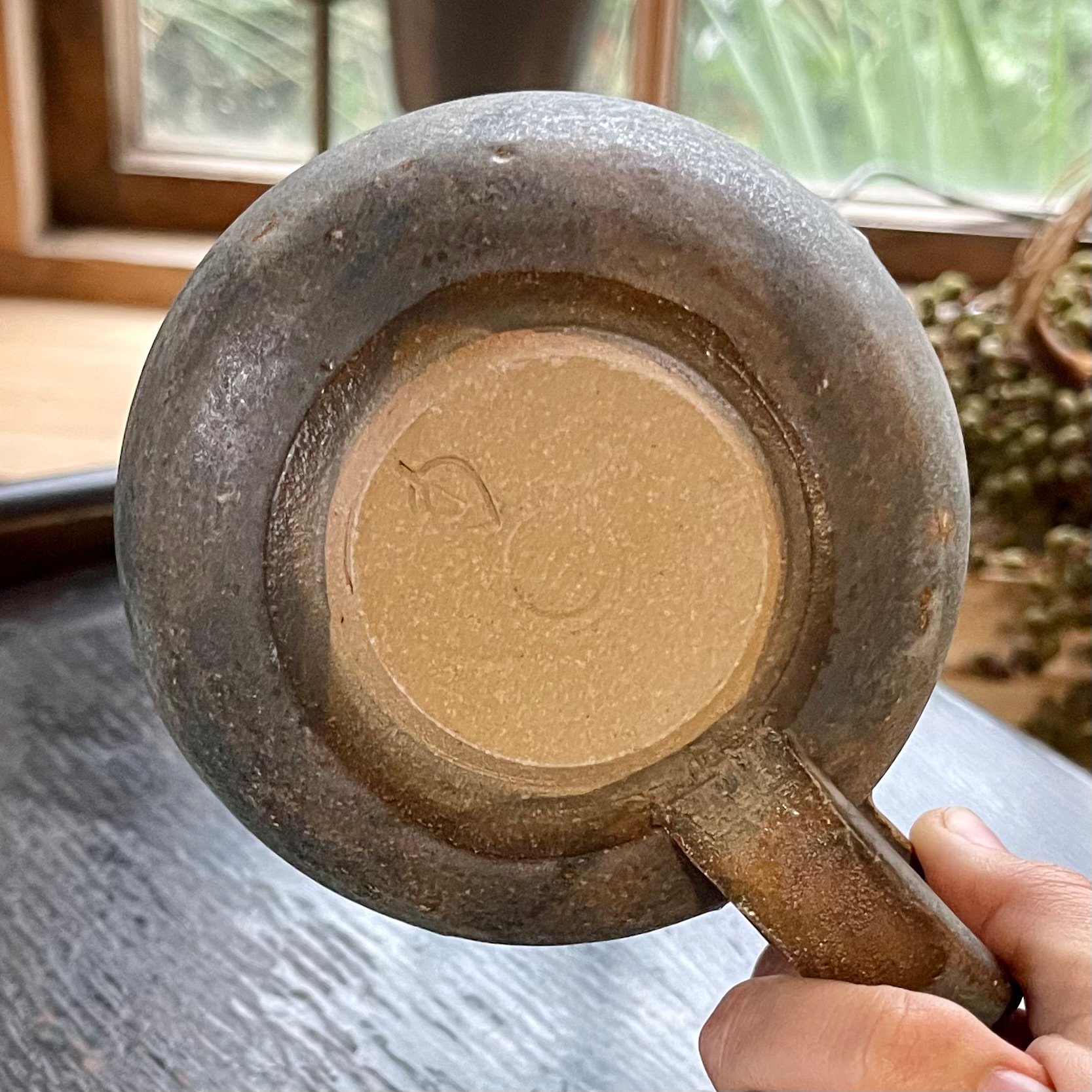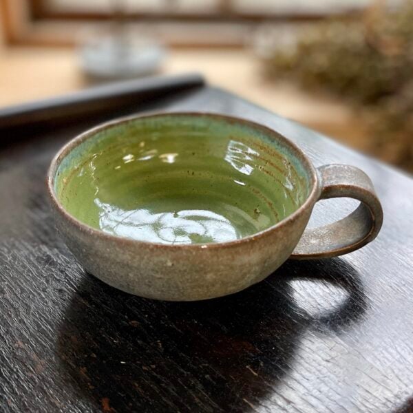 These Stoneware Mugs are thrown on the wheel and finished by hand. Each one is ever so subtly unique and decorated with an individual combination of glazes that accentuate the contrasting finishes between the interior and exterior. The exterior layered stoneware finish is satisfyingly textural with additional hints of clustered bronze lustre particles. The interior is decorated with soft pastel shaded tin/chromium glazes. They are a very satisfying shape to drink from. I’d even go so far as to say that the generous handle and the feel of the textured stoneware does something to enhance the experience too.