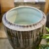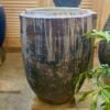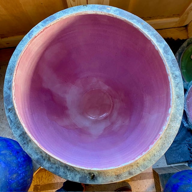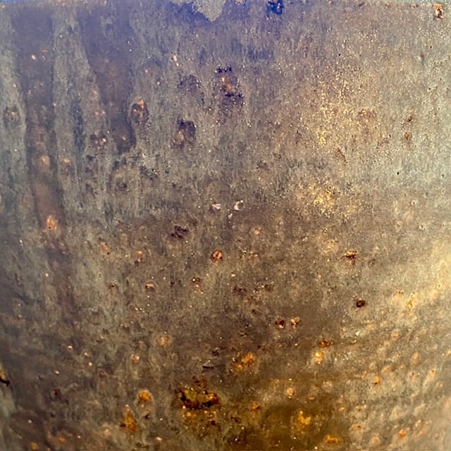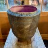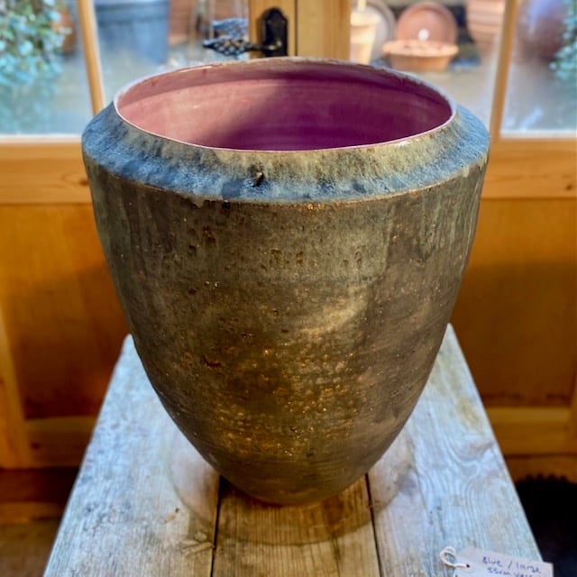 These Large Stoneware Vessels are thrown on the wheel in three sections, joining the sections with additional slip and then throwing a coil to create the rim. Each one is unique and decorated with an individual combination of subtle glazes that accentuate the contrasting finishes between the interior and exterior. The exterior layered stoneware finish is satisfyingly textural and matt with additional hints of clustered bronze/gold lustre particles that catch the light with a contrasting iridescence. The interior is softly ribbed in concentric circles and the pastel shaded tin/chromium glazes applied to embellish this texture. The rim is approximately 8cm wide and treated with a lighter mix of glazes to accentuate this part of the design. If you are wondering: the oak plinth is absolutely integral to elevate the vessel so that the eye can appreciate its line and form.