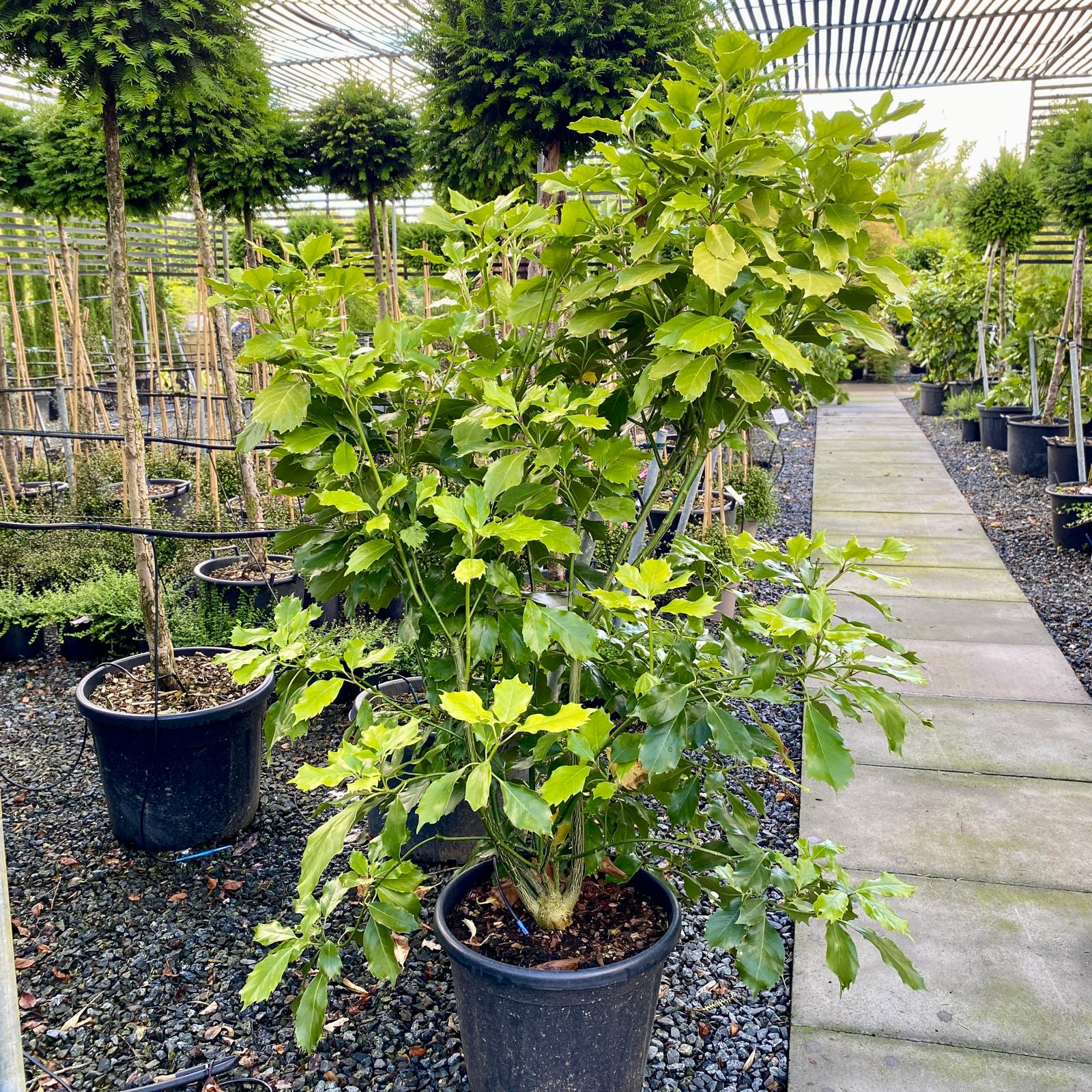 It seems indifferent to soil type, cold or heat. Makes for an excellent first plant or plant for a first-time home owner. It will grow quite happily in full sun but the leaves become slightly bleached yellow - not so dark green and glossy. It occasionally bears little red fruits. The flowers are yellow and frothy but not showy. Severe frost (-4°c or below) will give the leaves a glazed, pendulous look but they recover wonderfully well as soon as the temperature rises. Plant high, exposing as much of the taper at the base of the trunk as possible. Keep very well-watered when first planted.