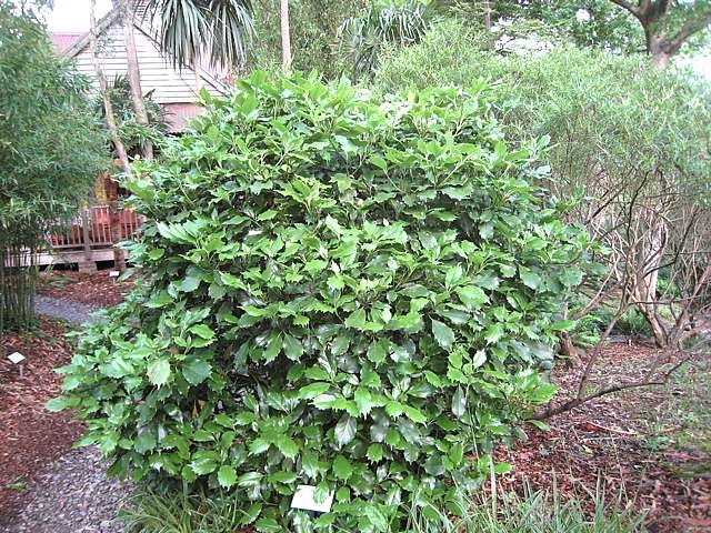 The original cuttings (1989) came from an old plant (still there, I think) just inside the Elizabeth Gate at Kew Gardens in Surrey. It's in full sun but the plant looks much better in shade - big glossy, healthy leaves that never seem to be sullied by pest or disease. It will grow quite happily in full sun but the leaves become slightly bleached yellow - not so dark green and glossy. There's a strap line we've always used on a very robust Hebe we grow - "Kill this and give up gardening". I think we could safely say the same about this. It occasionally bears little red fruits. The flowers are yellow and frothy but not showy. It seems indifferent to soil type, cold or heat and will grow to 6ft x 6ft in about 5 years.