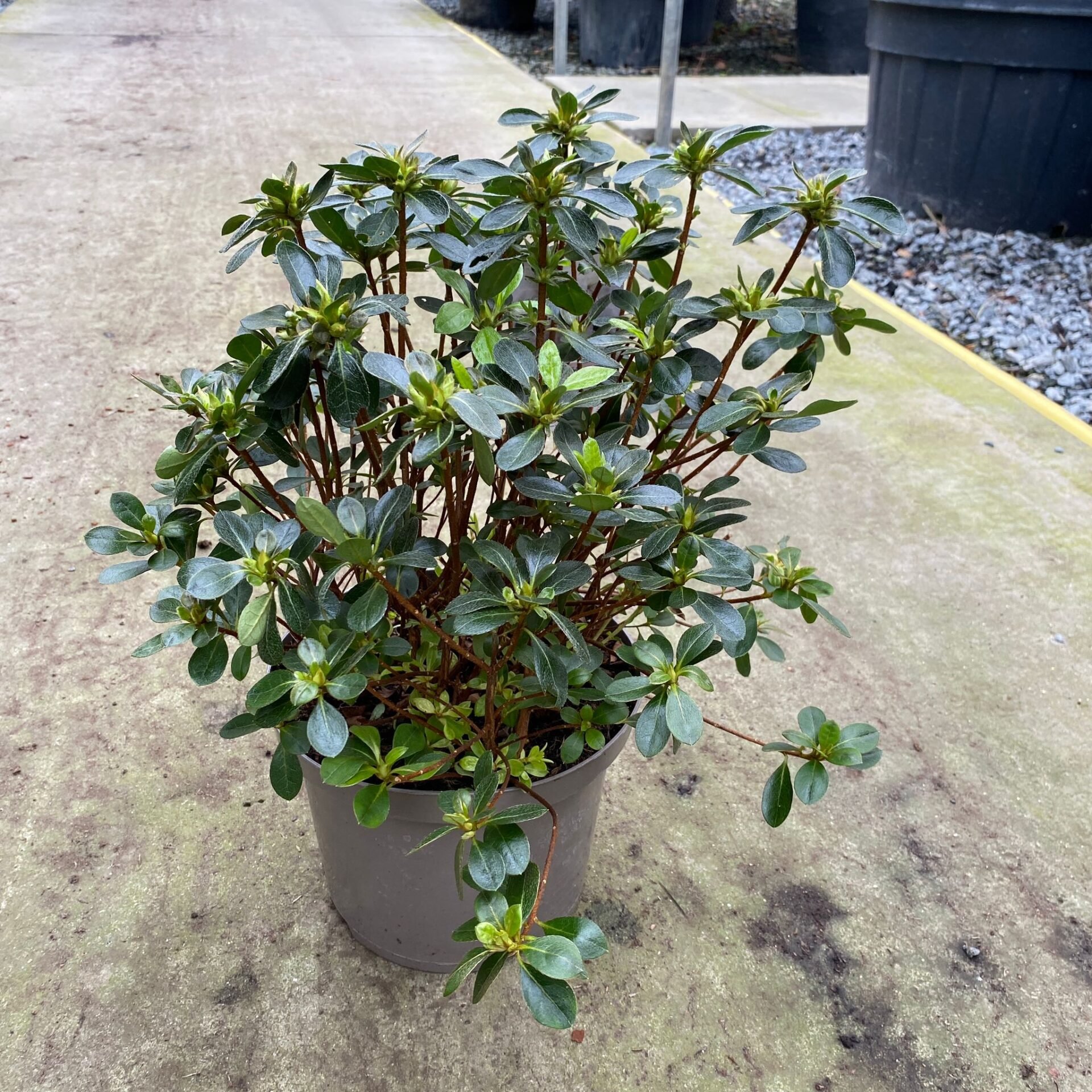 Japanese evergreen Azaleas need well drained acidic soil. Slow growing, free flowering (red, white, pink and purple) to about 5ft after many years. In Japan, they clip them. Nice little blobs.