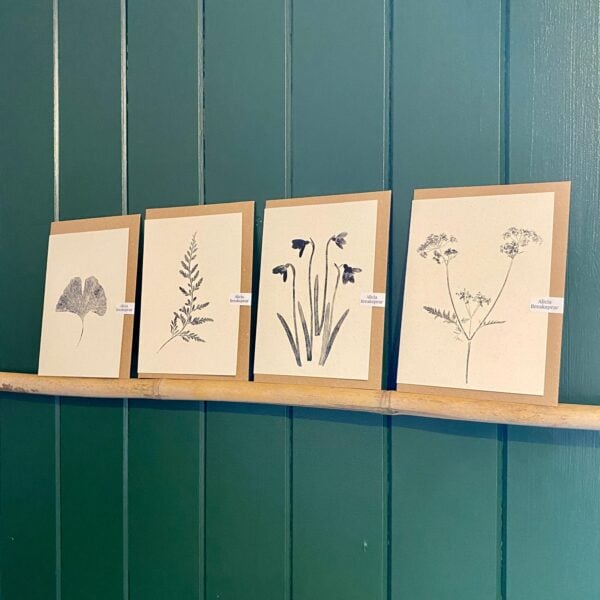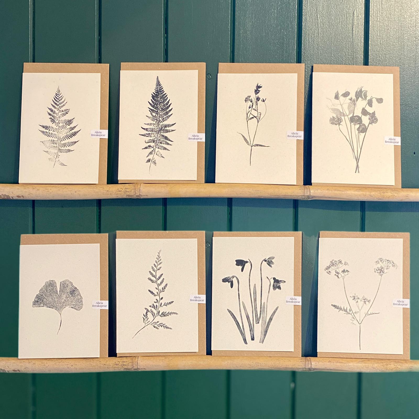 Discover the elegant range of botanical monoprint greeting cards, featuring 21 different plant species. Pick from ferns, flowers and leaves. Purchase them as singles or pick 4 for £10. They have a vintage feel to them due to the ivory coloured card stock. These designs have been created by printing directly with pressed plants.