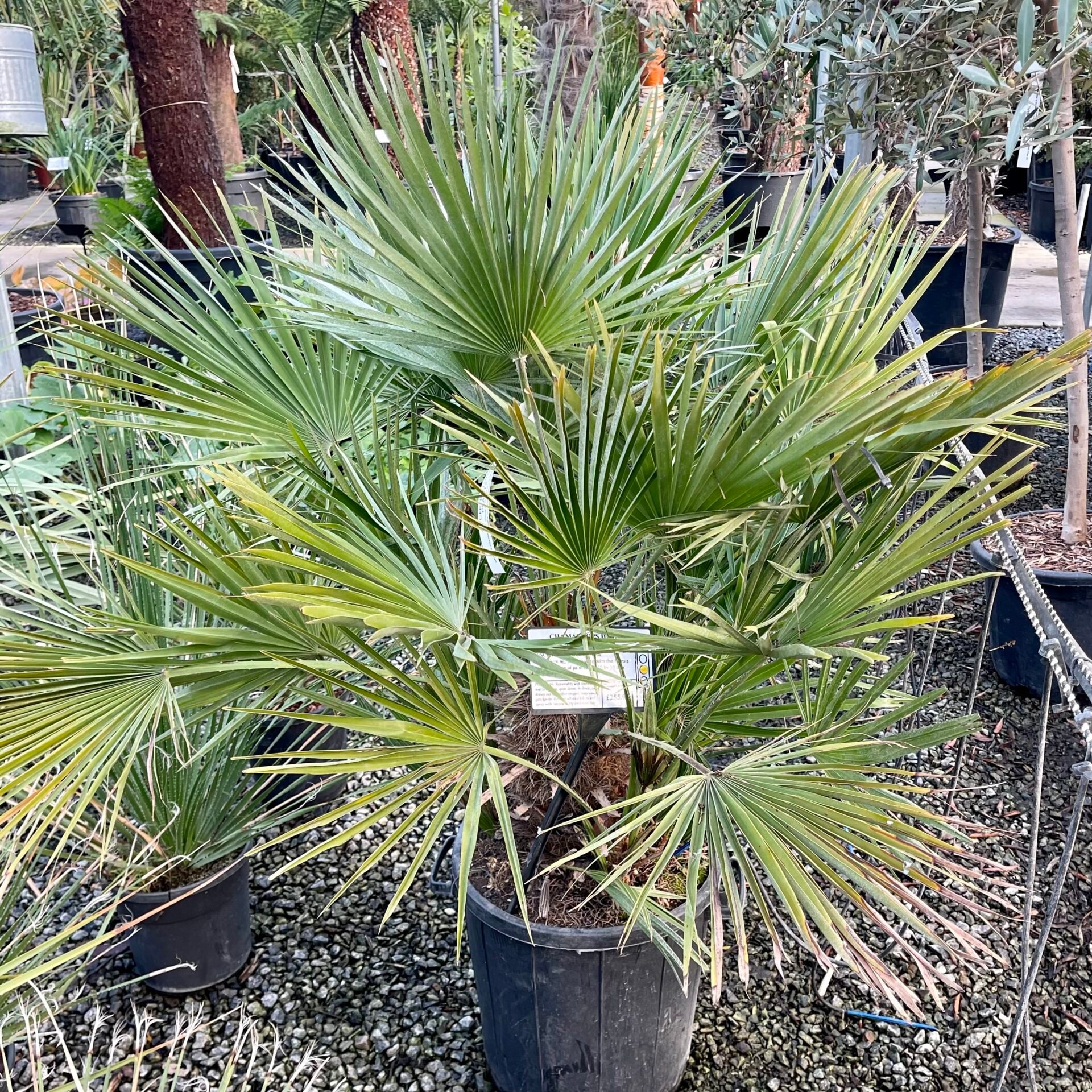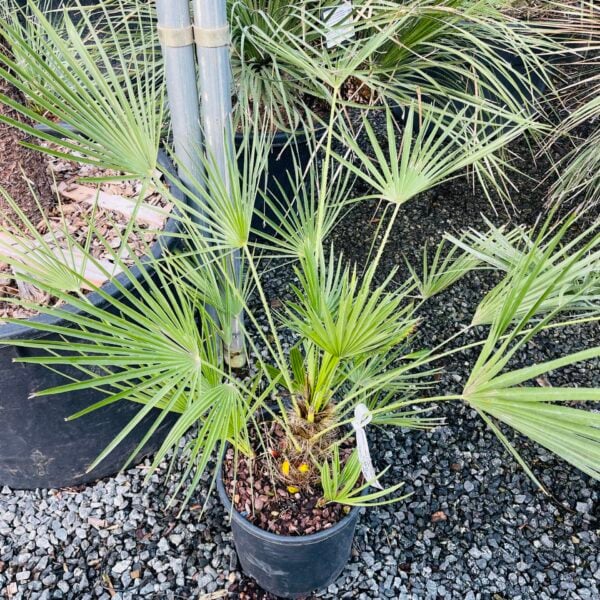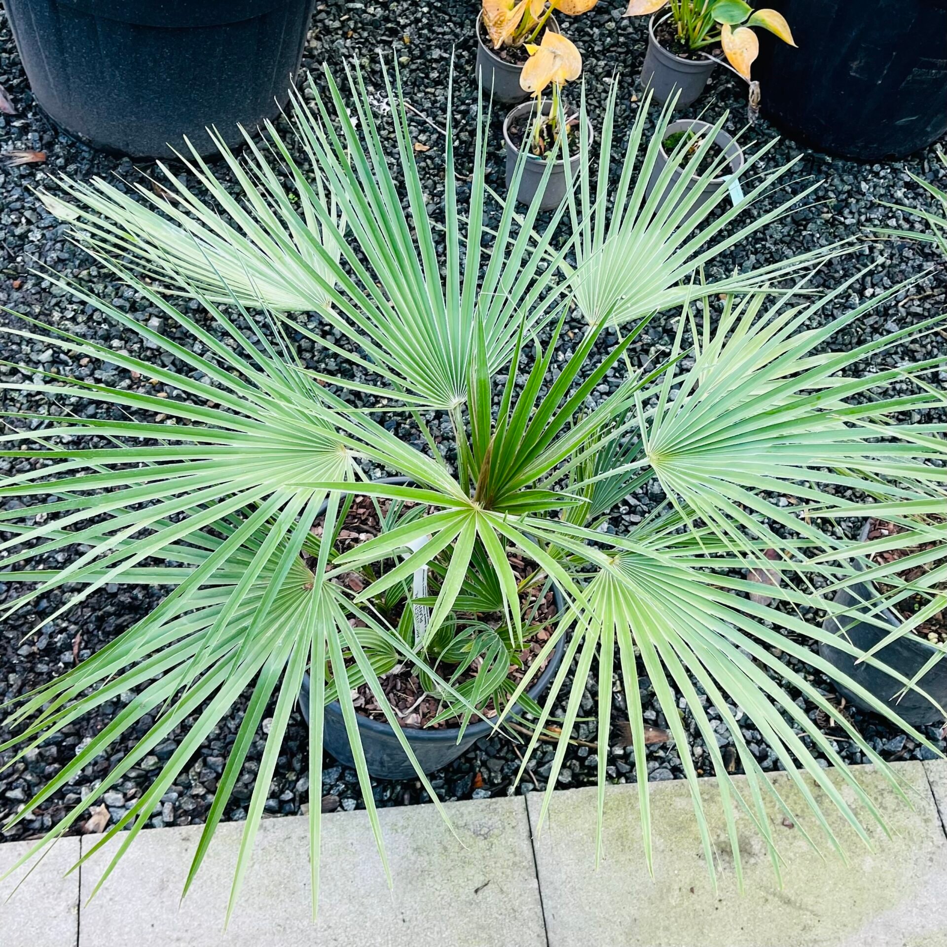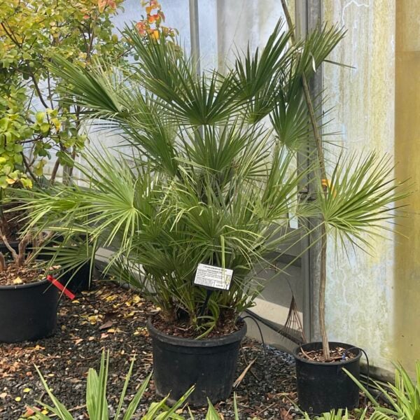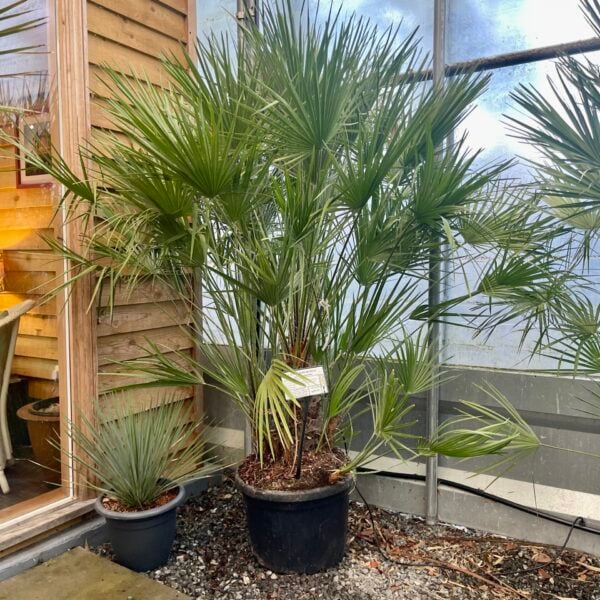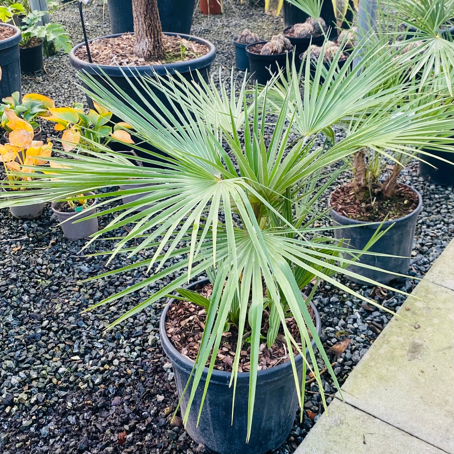 A mass of palm leaves. Grows out as much as up – producing lots of suckers. Smaller but more wind tolerant than Trachycarpus. Exotic and easy. Sun or shade.