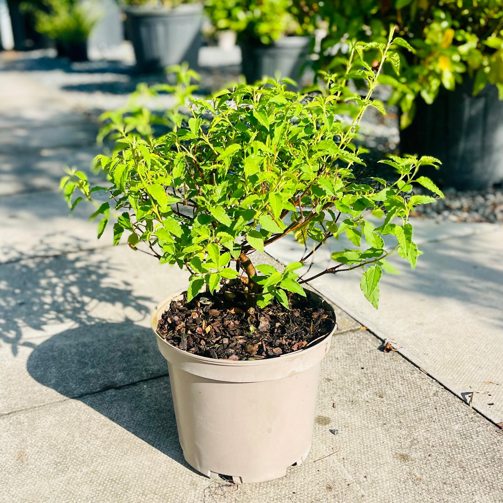 A hardy, dense shrub with a rounded, finely-textured form and very pretty, crinkly-edged leaves. These are aromatic when smooshed, and especially evocative on hot sunny summer days. The red sepals of their flower buds open to reveal crinkly white tissue paper blooms, square-ended, tousled and dotted with the yellowest of yellow centres and even yellower- yellow stamens. Though each flower only lasts a day, they are produced with great generosity over a decent stretch through July and August, and bees will go bananas for them. One of those wonderful plants you can hear before you see it: buzzing.