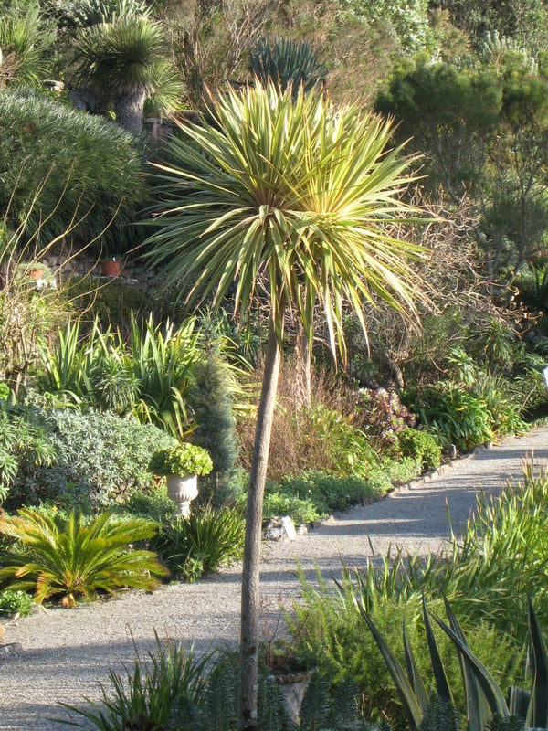 King Albert's Cordyline. He was king of the Belgians (reigned from 1909 to 1934). Why was this plant named after him? Absolutely no idea. It's not tremendously hardy but will certainly take the sort of frost endured in the middle of big cities and within 3 miles of the coast. We're not famous for our love of variegated plants but this (because of its variegation) grows slowly and is so elegant and slender of trunk. It's a really pretty little plant and as long as its feet don't get too wet, robust and easy. You can even leave it in a pot for several years and it won't complain too much. Remove the old leaves as soon as they're discoloured from age. It's a nice job - you don't need to cut them. Just pull them off and it'll leave a smooth trunk. If you keep it in a conservatory or greenhouse it'll probably get Red Spider Mite which needs to be dealt with. Biological control is the answer. Alternatively - if you have the time - take a soapy sponge and wipe the underneath of every leaf. Bit time consuming but it works.