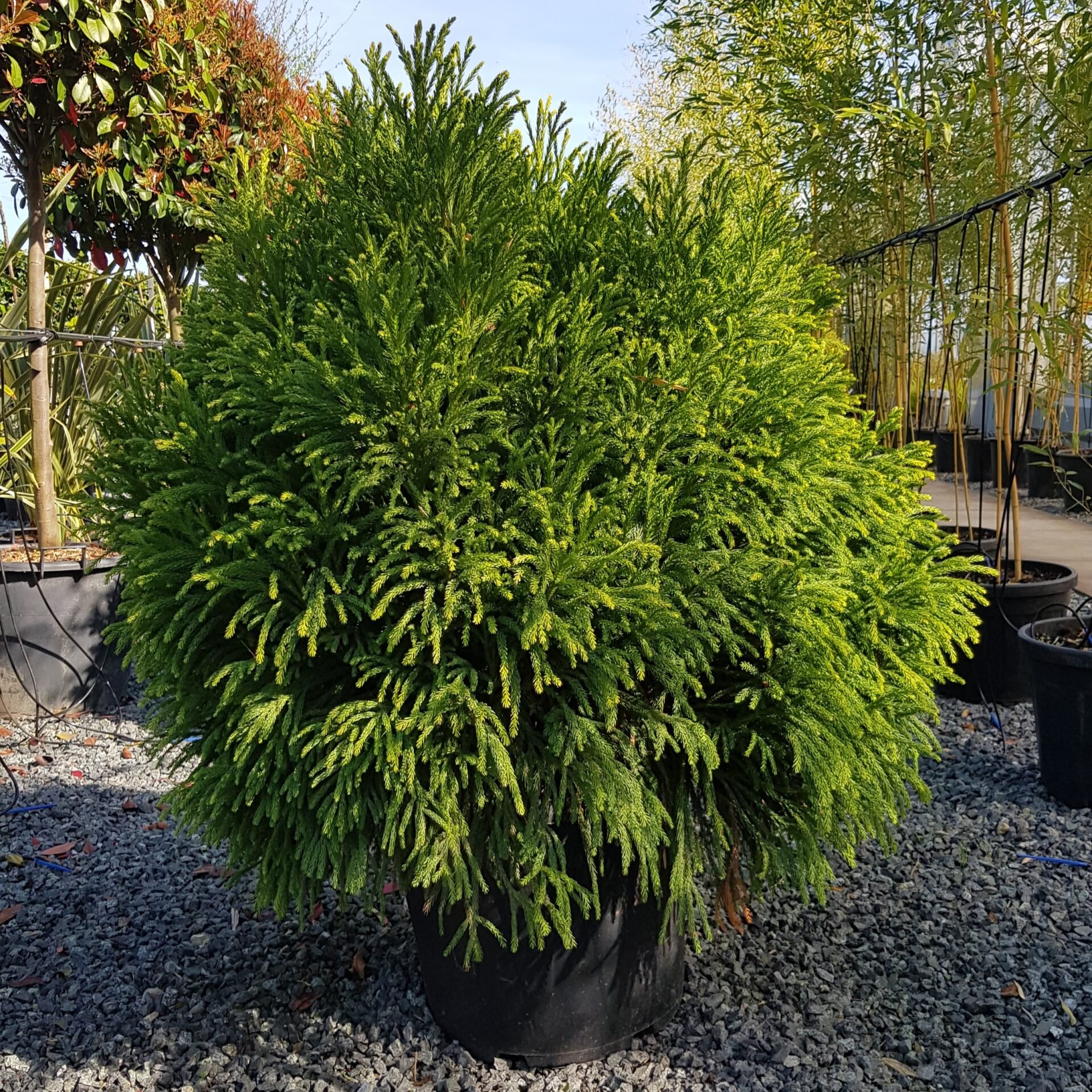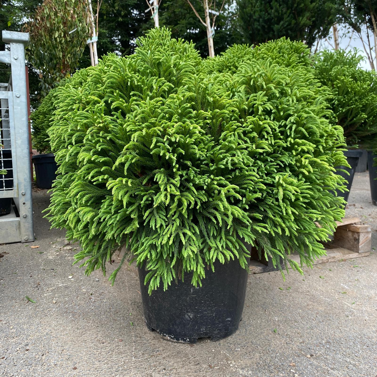 Fluffy, lumpy and lovely. ‘Globosa Nana’ is a slow growing evergreen conifer that could be considered miniature as it takes many years to reach even six foot tall and about the same wide. They’re grafted in Italy and grown-on by us