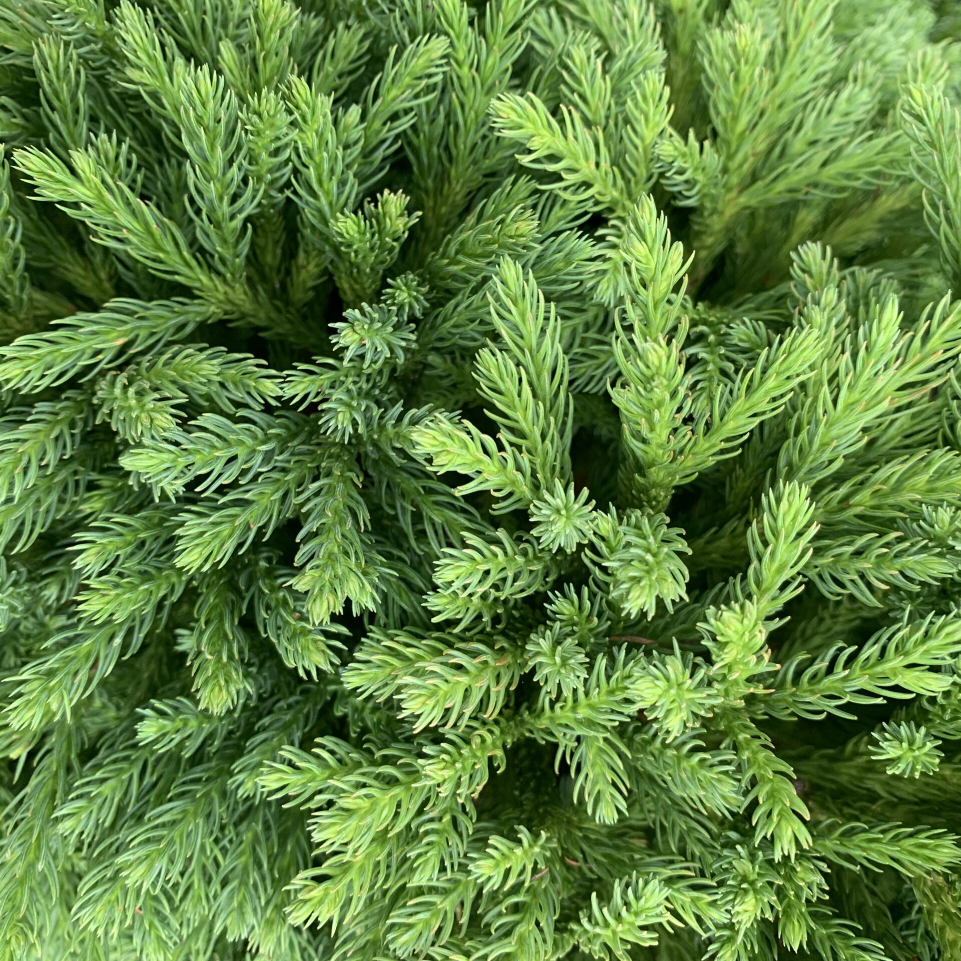 Fluffy. Very fluffy. And lumpy. Evergreen, coniferous, slow growing – to 6ft after many years. Sun or shade but greener in a bit of shade. Can be clipped if thought necessary.