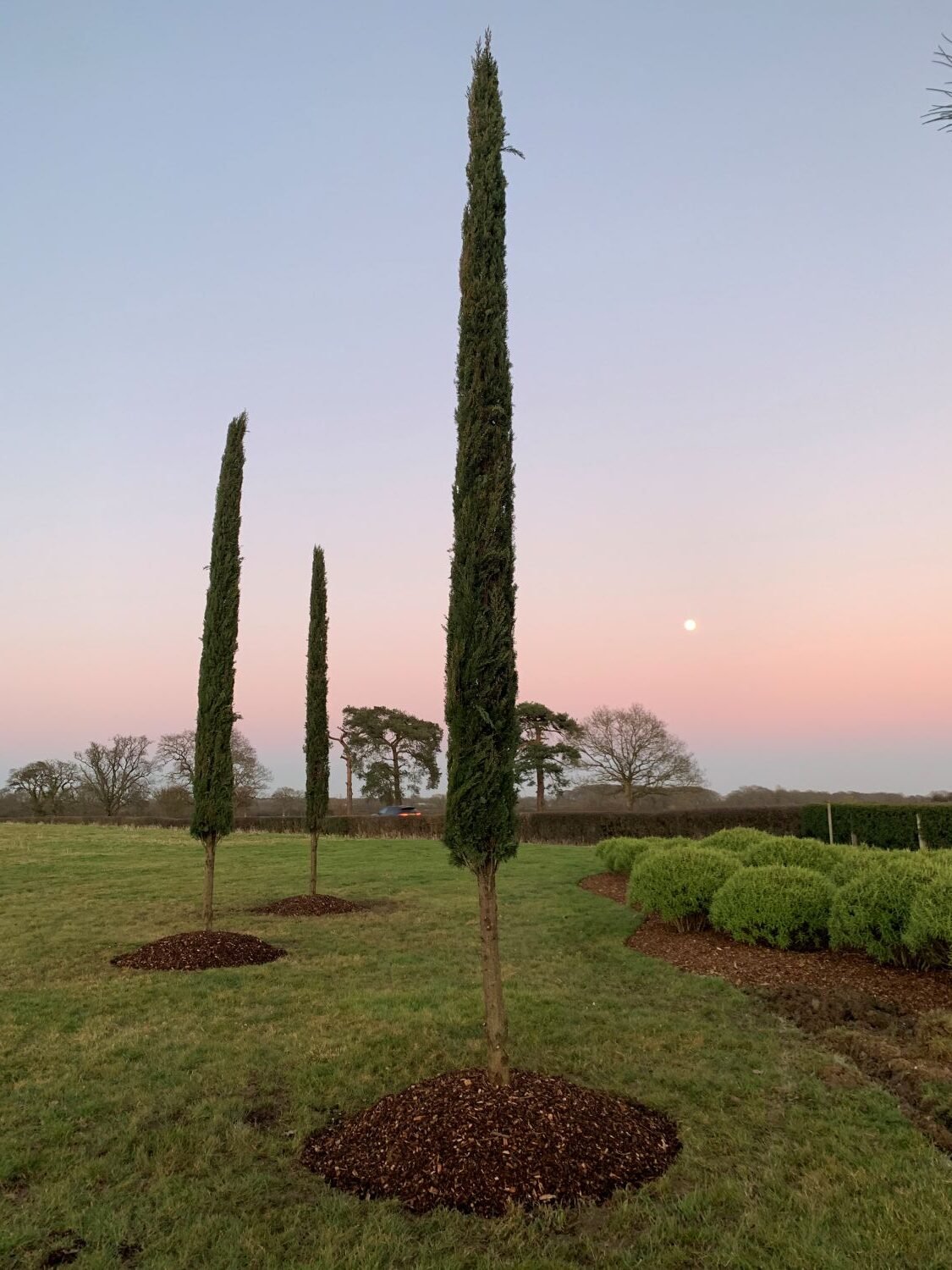 This is an immensely variable tree. It will survive in very harsh climates and in Cyprus (for example) one will often see them used by farmers as windbreaks. They will have been grown from seed, primarily, to do a job. If you have a row of twenty Cypress grown from seed, every single one will be different. The form we have is grown in Italy and is called Cupressus sempervirens 'Pyramidalis'. Not sure why because it's not remotely like a pyramid but it's chosen for its narrowness and reliability. There are many other named forms - 'Green Pencil', 'Stricta' and 'Totem' spring to mind. All much of a muchness but we avoid the form called 'Totem'. Delicious looking but more expensive and less reliable in this country.