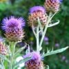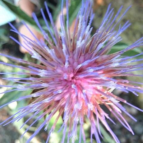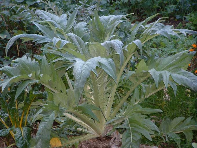 Cardoon. Get the soil and position right and this is magnificent. Lots of light plus vegetable garden soil – lots of organic stuff, well fed and well drained. Just like your leeks would like. Do this and it could be 4ft x 4ft by May. It’s closely related to the Globe Artichoke – similar looking but bigger but the flowers are the same. Stalks with a gas ring on top with a blue flame.