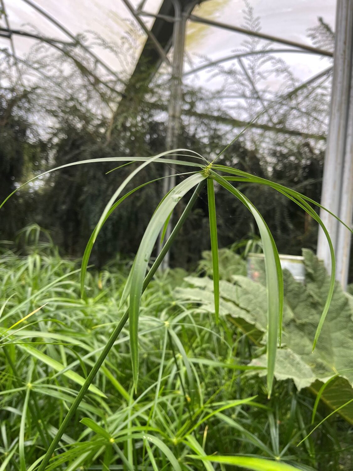 Cyperus alternifolius, a mini Papyrus – to 4ft. Thickets of miniature palm trees. Reputedly tender but not in our experience. Dies down in winter but always returns. Good in a pot. Easy plant.