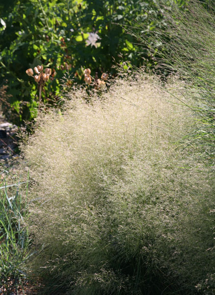 An airy, fluffy evergreen grass. Silvery gold flower spikes that start in July and last well into autumn. It can grow to 2ft by 2ft.