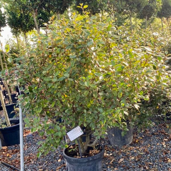 One of our stalwarts. Evergreen bush for use as hedge, topiary or tree. No amount of wind, salt or frost will fluster it. Little edible fruit and fragrant flowers in autumn.