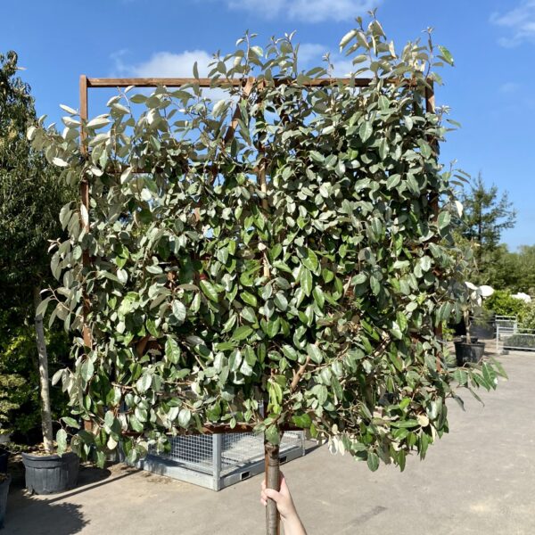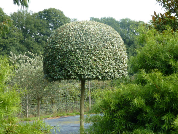One of the toughest evergreens on the planet. Left to its own devices, a wild disorganised thing so whatever we do with it, clipping is always involved. A real trouper of a plant. We find ourselves using this in all sorts of situations within the garden. Hardly surprising when one considers what they offer; they have pretty silver undersides to the dark green leaves, small sweetly scented, creamy flowers in the early autumn followed by little speckled oval fruits. They naturally grow as wild bushes so are even better when clipped into hedges or balls, equally when grown as standards or as pleached trees. They are as tough as they come, will cope with gales, and even with the salt laden winds of the seaside.