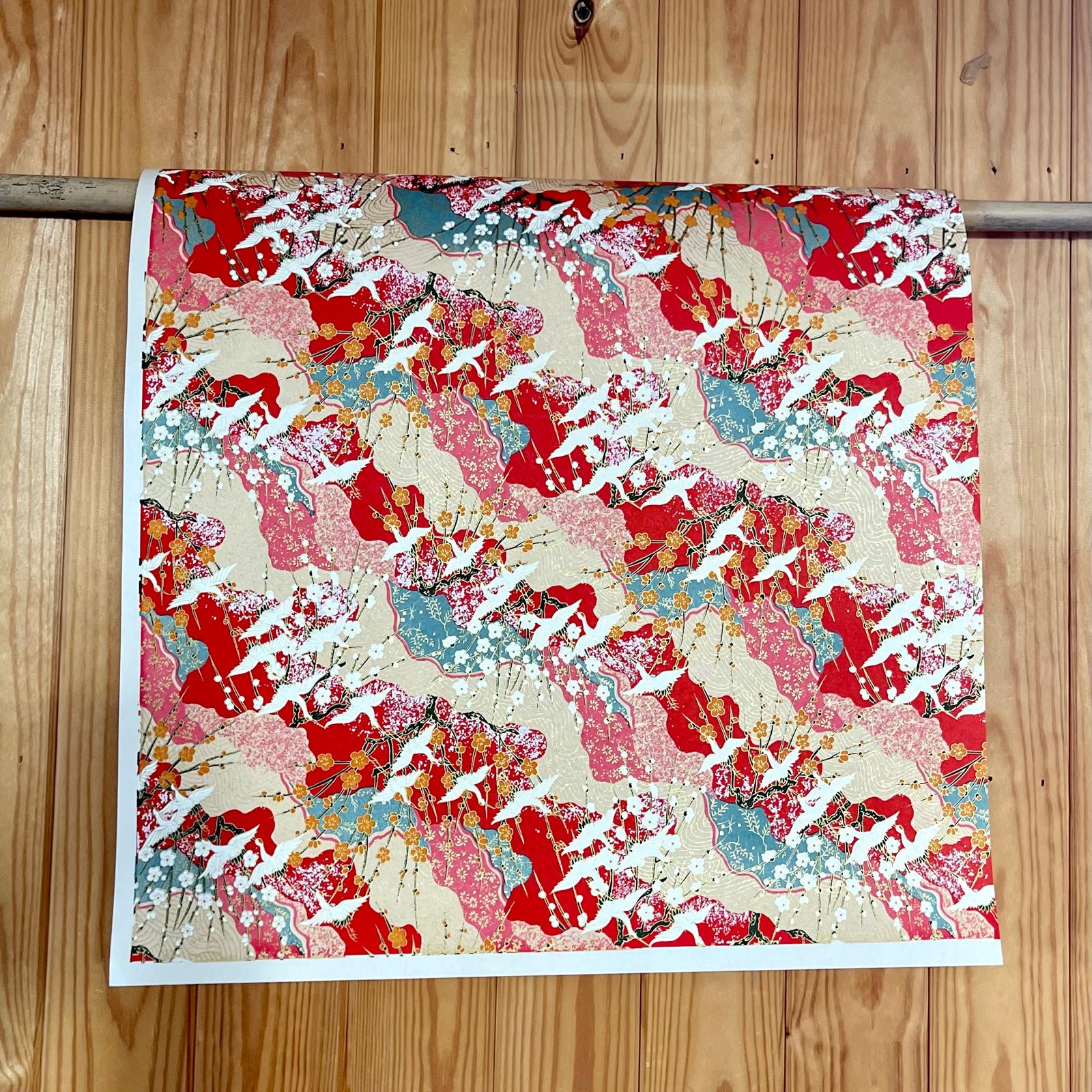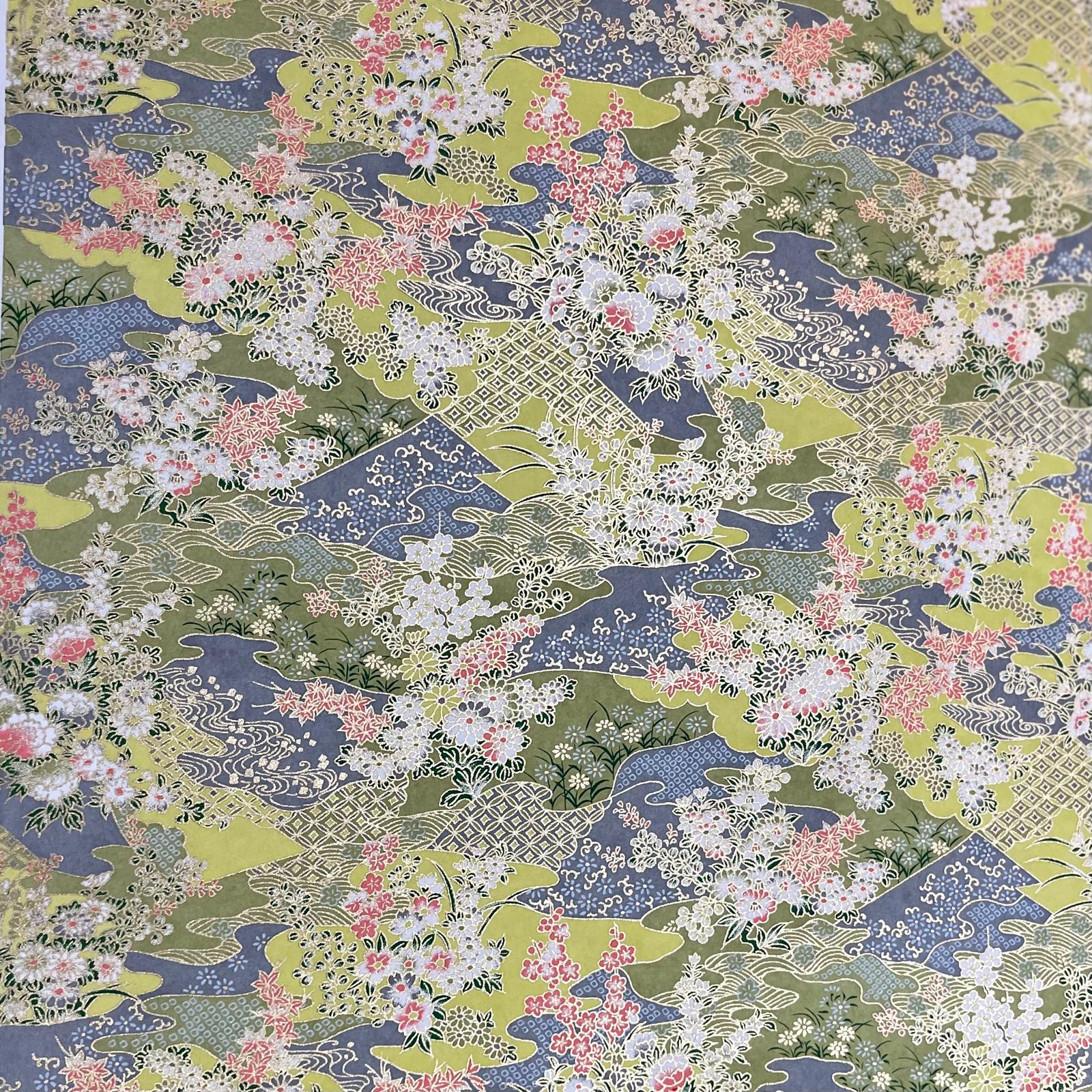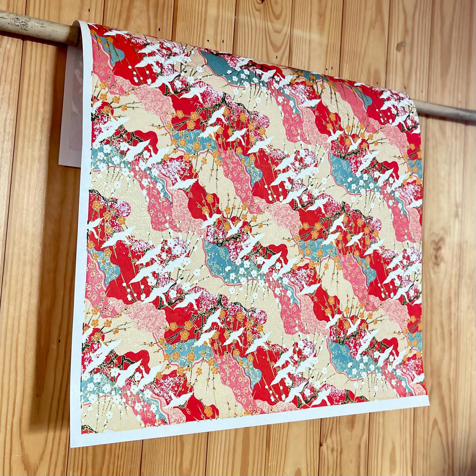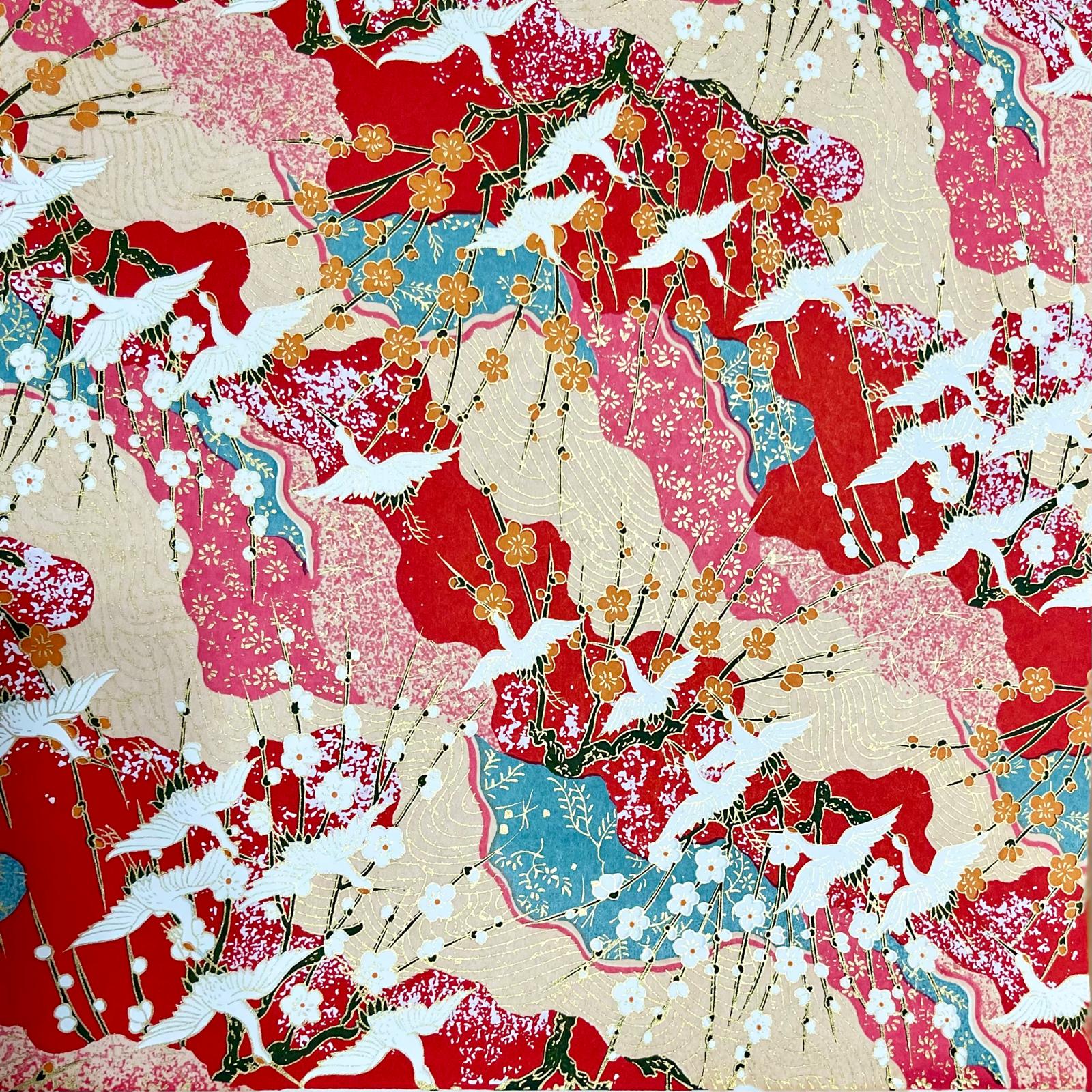 Explore Esmie's collection of silk-screen printed papers carefully selected from an extensive archive of designs in Kyoto, Japan, where we work with family-run studios to produce these exquisite designs in our colour specifications. Many of the designs (also known as Yuzen or Chiyogami) are inspired by textiles dating back to the Edo period (1603-1868), and incorporate symbols of Japanese culture and sensibility, including cranes for long life, blossom for beauty & longevity, bamboo for flexibility. Each colour is applied individually by hand, of which there can be up to 7, all registered with incredible precision, creating an extraordinary depth of colour & pattern, finished with metallic ink creating a beautiful gold lustre. The 88 g/m² base paper is a mixture of kozo and sulphite, despite being light weight, these papers are extremely durable making them suitable for many applications including, bookbinding, origami, box-making, as well as interior projects such as wall covering and furniture lining.