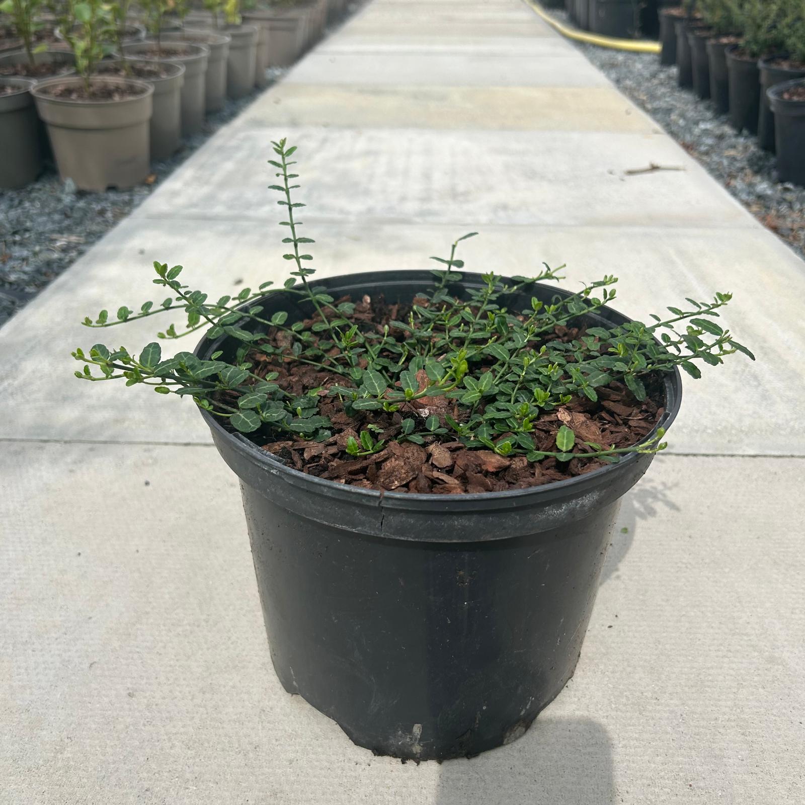 A mat of tiny evergreen leaves. Normally prostrate, it’ll scramble over anything. It’s a ground cover, fence cover, shed cover etc. Each plant forms its own little pyramid.