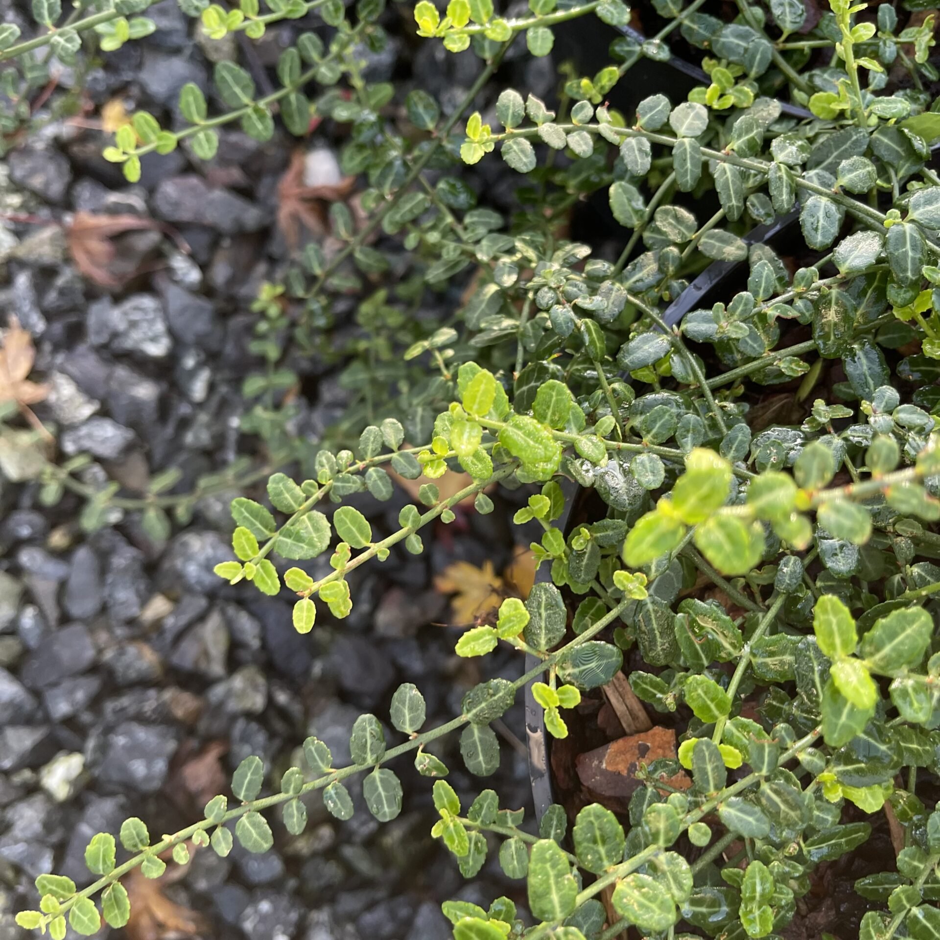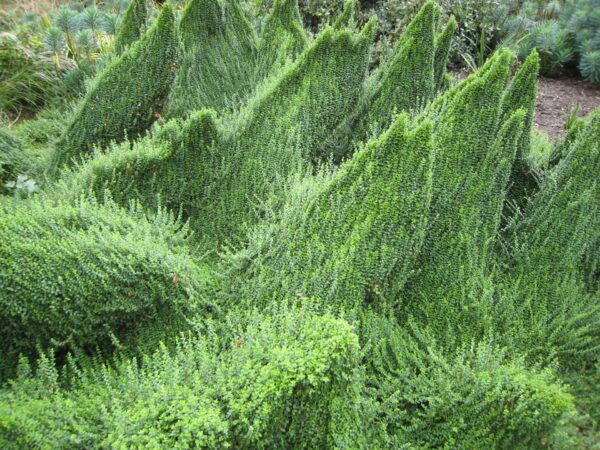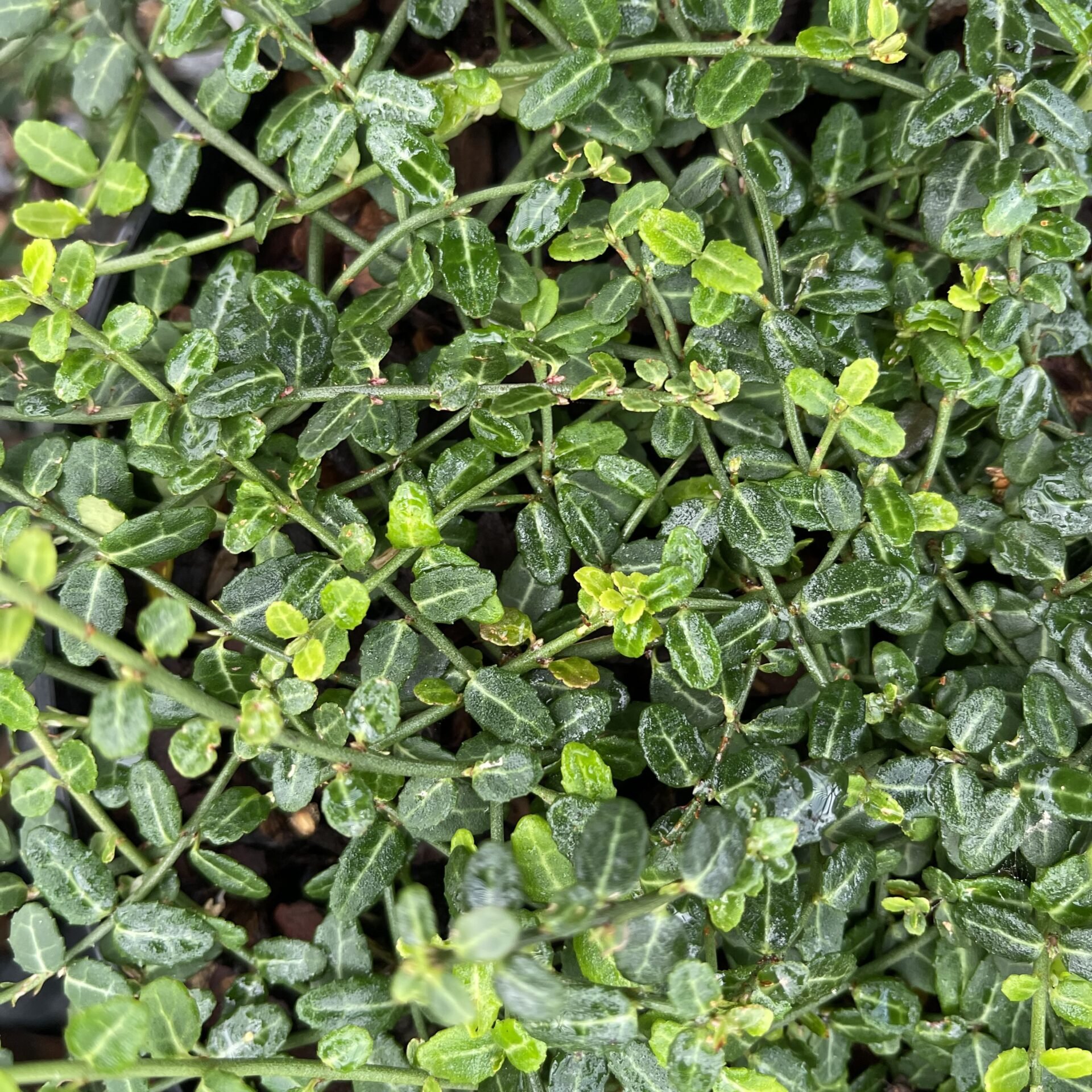 A mat of tiny evergreen leaves. Normally prostrate, it’ll scramble over anything. It’s a ground cover, fence cover, shed cover etc. Each plant forms its own little pyramid. Please contact us for stock availability and sizes.