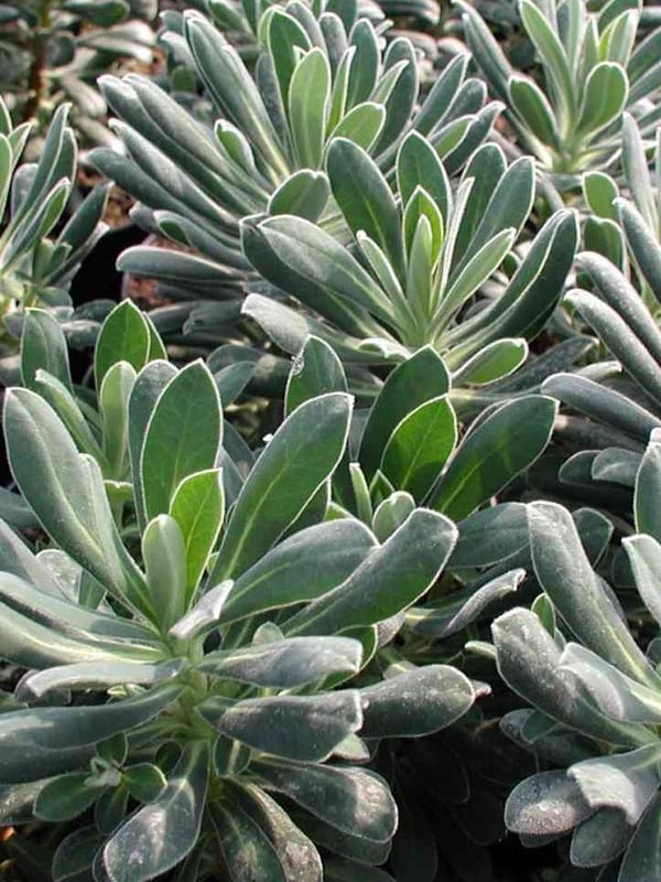 Low-growing dome-shaped evergreen shrub with chocolate-eyed flowers in spring. The grey-green leaves are covered with fine hairs, giving a velvety texture. To 1.5ft x 1.5ft. Please contact us for stock availability and sizes.
