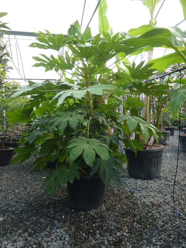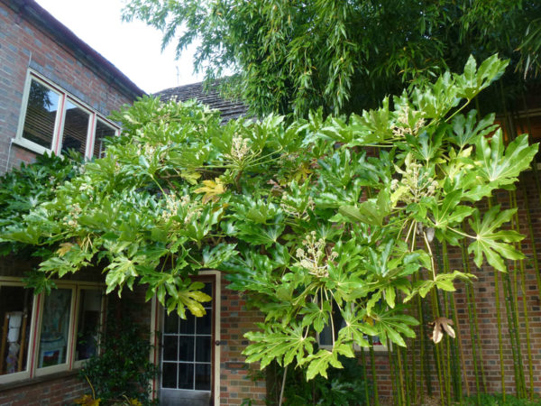 This well-known evergreen shrub from Japan is a familiar friend for a shady spot. Let’s say shrub-to-small-tree, reaching 15 ft tall and around the same wide in 15 years. It has great big lobed leaves with a high-gloss shine on them that give the plant a deeply exotic appearance, and its form can be very varied. We like to encourage a sturdy single trunk with a parasol of enthusiastic foliage billowing out the top: this makes it look a bit like a Papaya and has the sort of silhouette non-gardeny types will insist is like a ‘palm tree’. They’re not wildly wrong. There’s plenty of opportunities for Creative Maintenance with a Fatsia because they can be hacked at and controlled quite firmly and they dont mind at all. Leggy ones can be cropped right back to encourage fresh new growth and a fuller, broader form and with a little patience you can even get a good multi-stem specimen off the ground. These look tremendous underplanted with Liriope, ferns and the like.