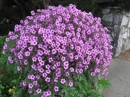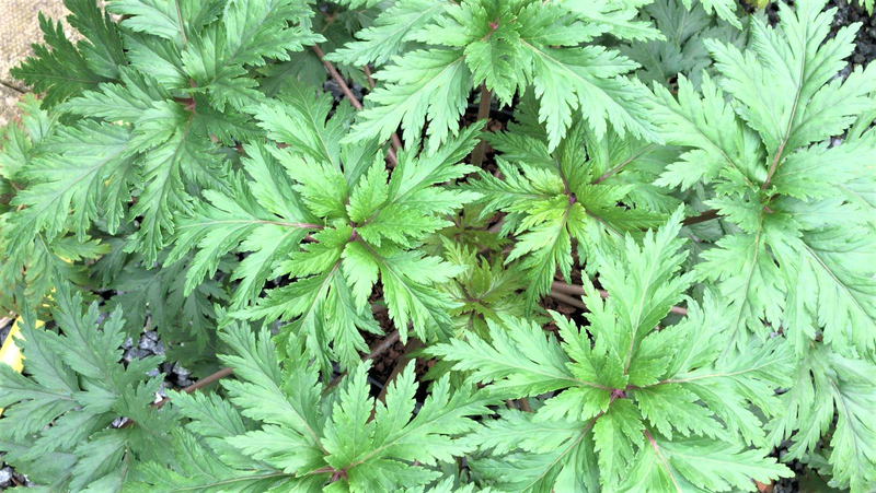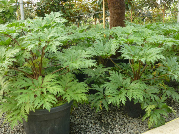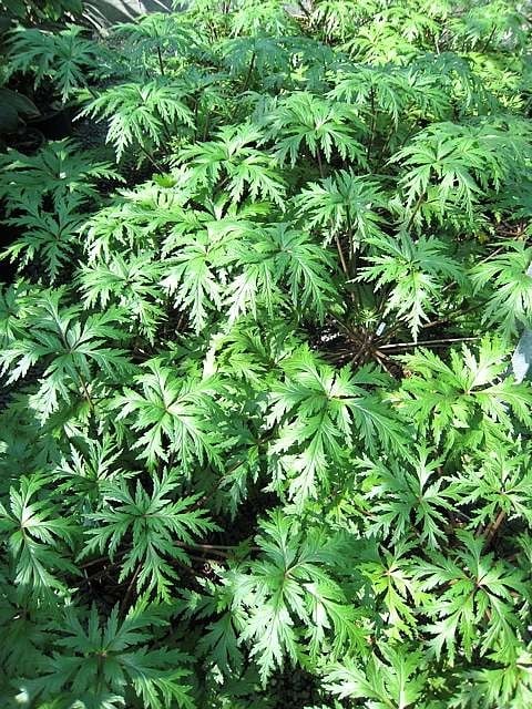 Compact shape with deeply cut leaves and pink flowers. Grows to 3 ft across and 2 ft tall. If your garden’s too cold, bung it in a pot and in a shed for the winter. Exotic.