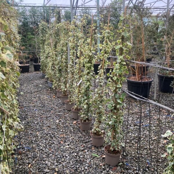 Lovely plant, the dark green leaves are mottled with creamy-yellow borders, perfect for screening as it both climbs and trails. Starting slowly, it can eventually cover 8m x 3m. Self clinging and hardy, the mature plants produce balls of little yellow flowers that develop into black fruits, particularly beloved of blackbirds.