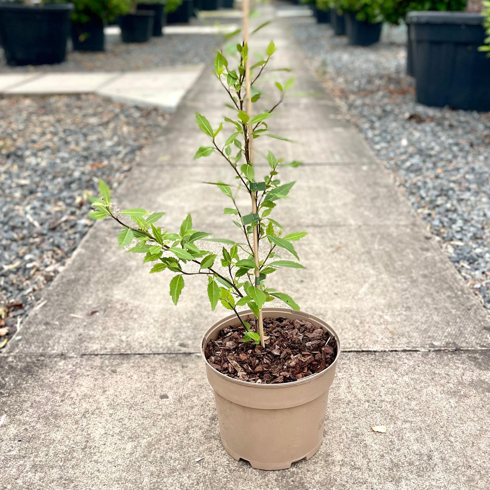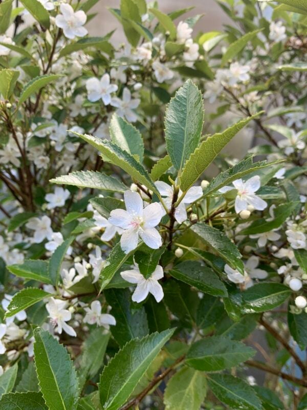 Yet another super evergreen from New Zealand, growing steadily into a large glossy shrub or small tree with a neat and compact silhouette. Clothed very densely in small jagged-edged dark green leaves the overall form is upright, columnar and softly rounded with a medium texture. In July and August you’ll be treated to masses and masses of honey-scented white flowers that will smother the whole thing. A very appropriately-named plant, as on ‘Stardust’ these luminous blooms look especially enchanting against the dark and glossy foliage: galaxies of them scattered over their vaulted green canopies.