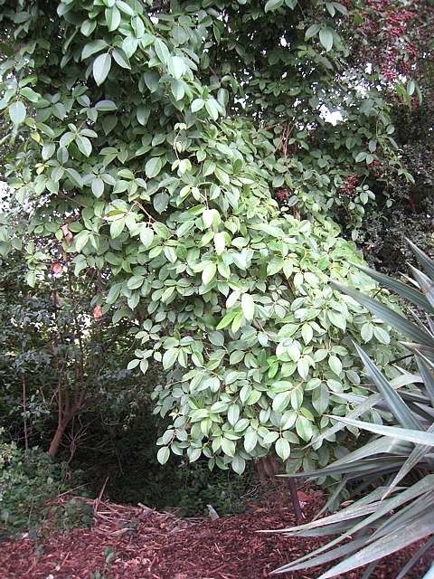 Dense evergreen climber with beautifully fragrant little whitish flowers in late March. Grows with vigour and bears edible fruit that look like well battered testicles.