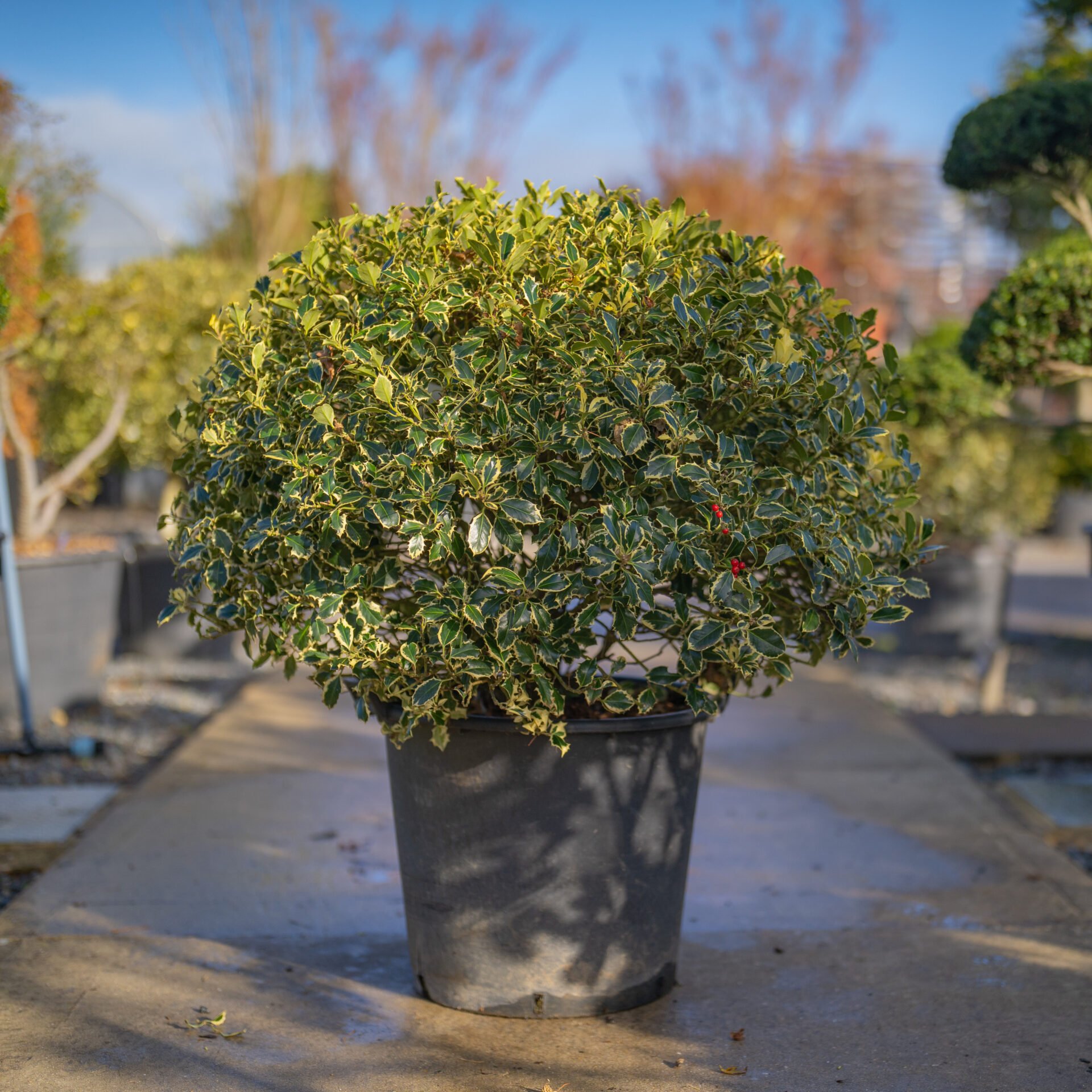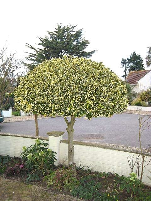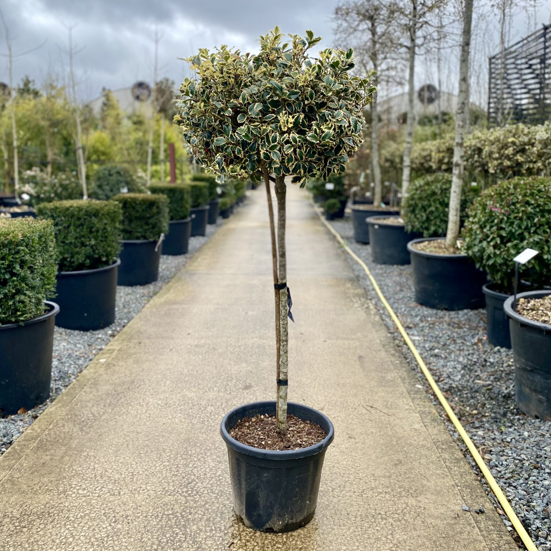 There are many different forms of Ilex aquifolium. We stick to the one that's familiar. Usually as a half standard (3ft trunk with a rounded clipped top).